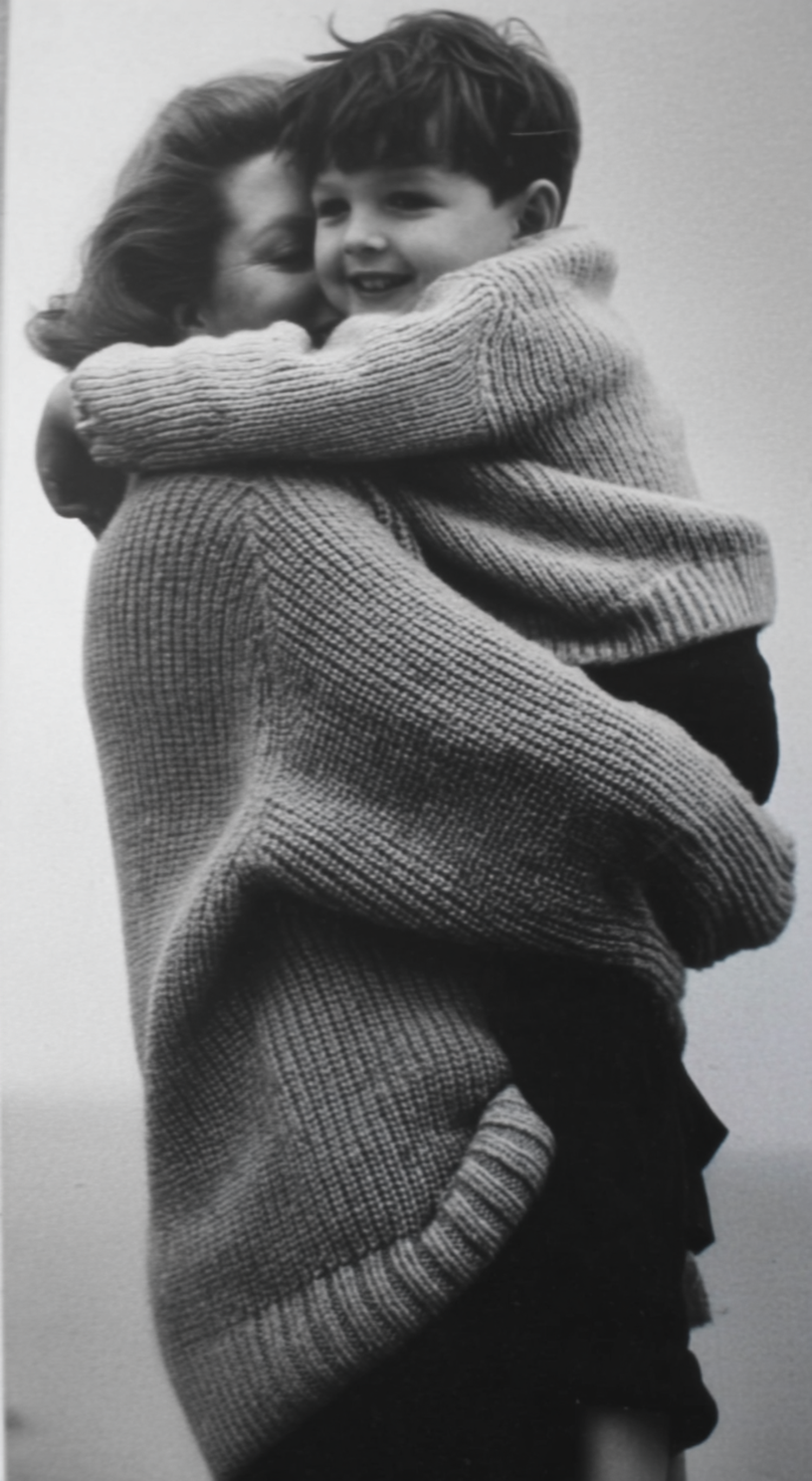 Heartwarming black-and-white photo of a woman embracing a smiling boy, both in cozy knit sweaters, radiating love and warmth.