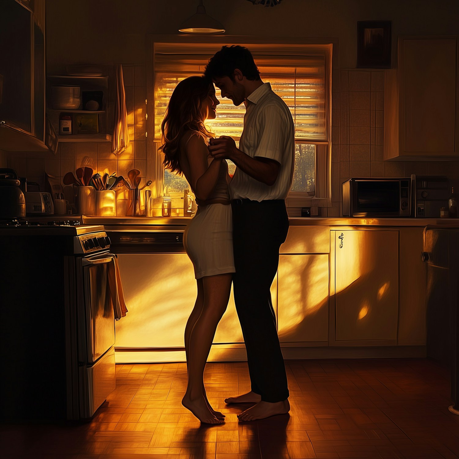 A couple shares a quiet, intimate moment in a warmly lit kitchen, bathed in golden sunlight streaming through the window blinds.