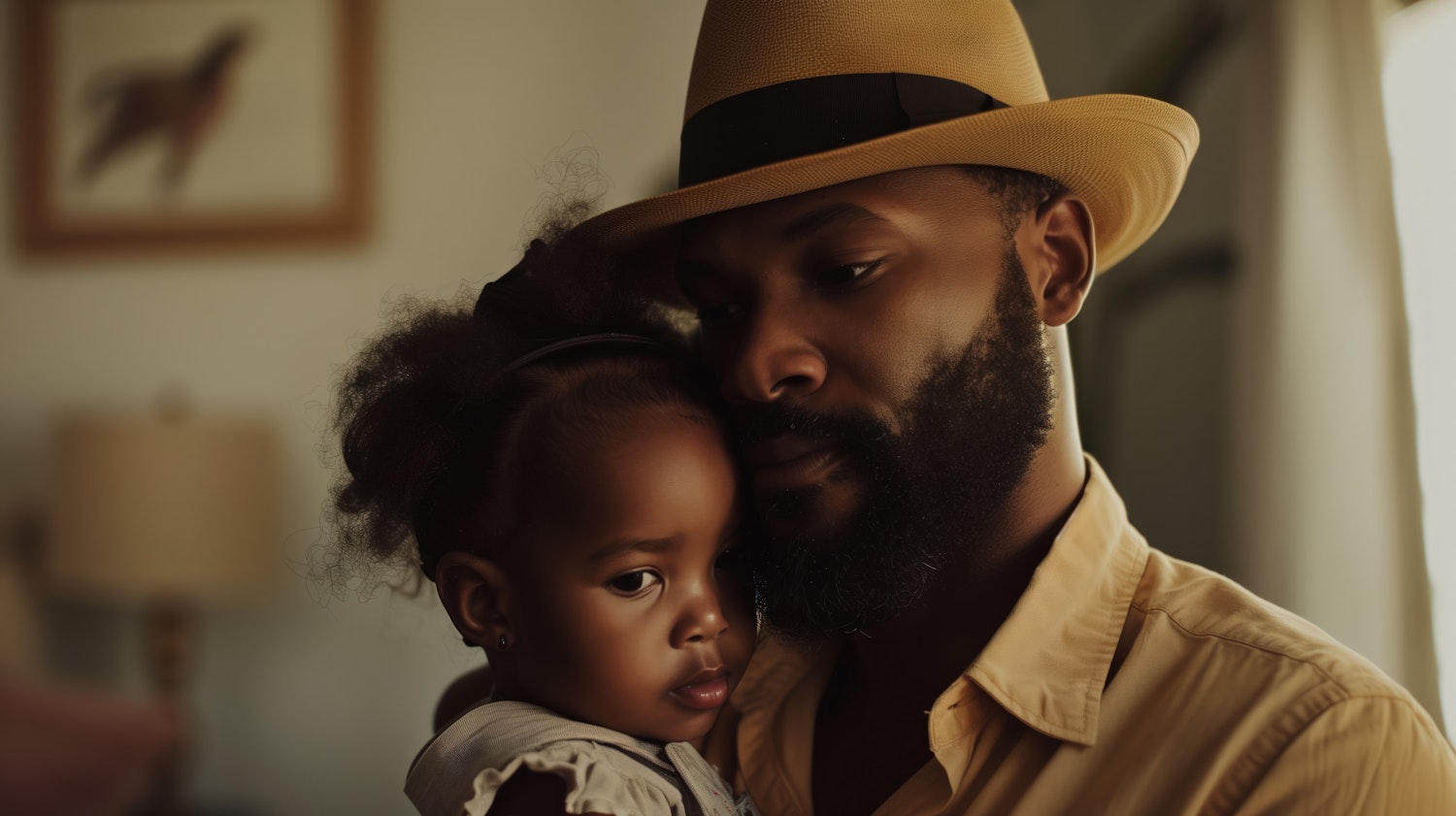 A tender moment between a father and daughter, captured in warm, intimate lighting. The man wears a straw hat, holding the child close.