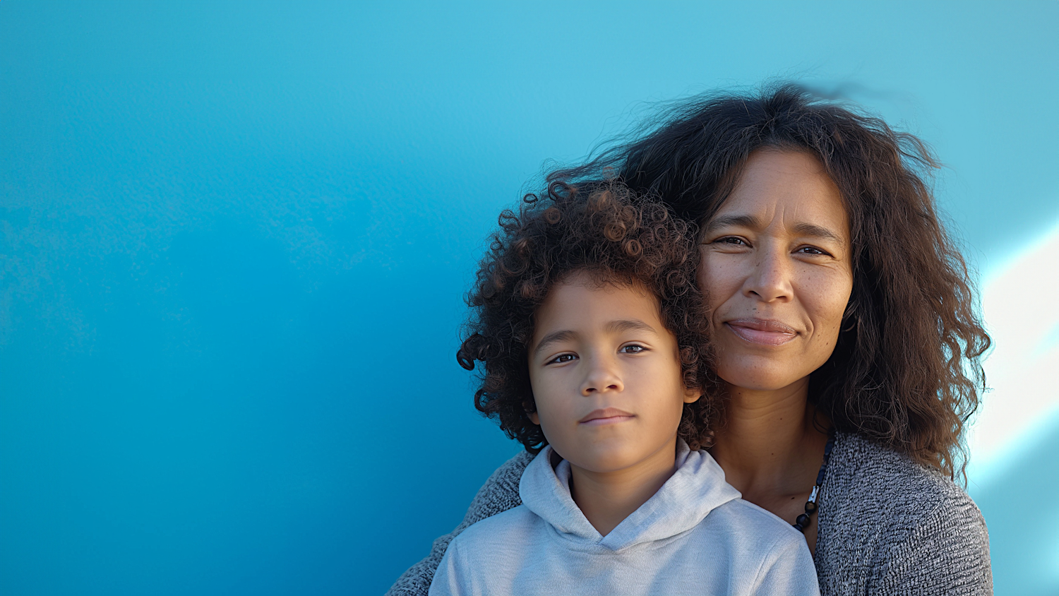 A woman and child with curly hair stand against a bright blue background, exuding warmth and connection.