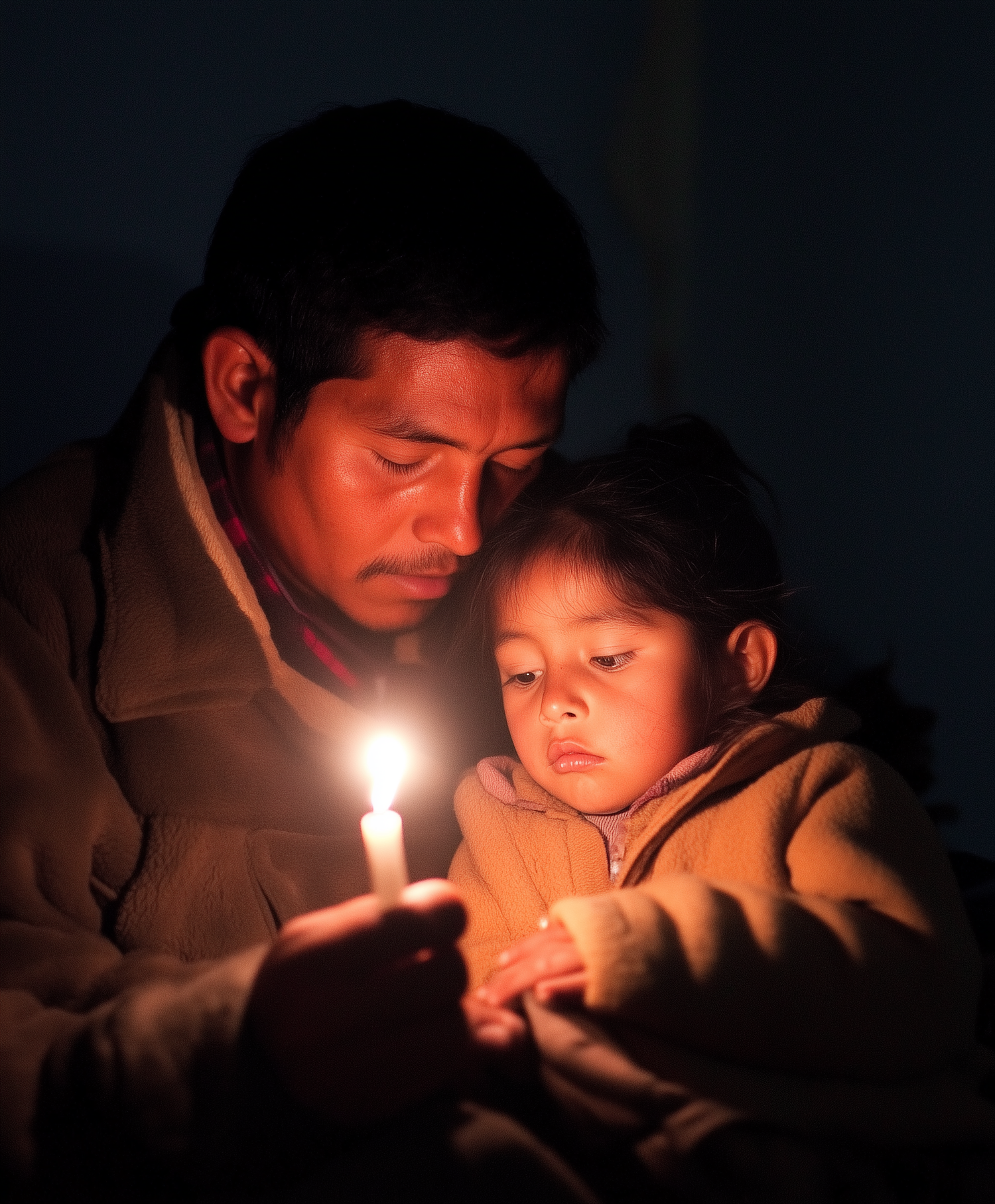 A man and child share a tender moment by candlelight, wrapped in warm coats, creating a cozy and intimate atmosphere.