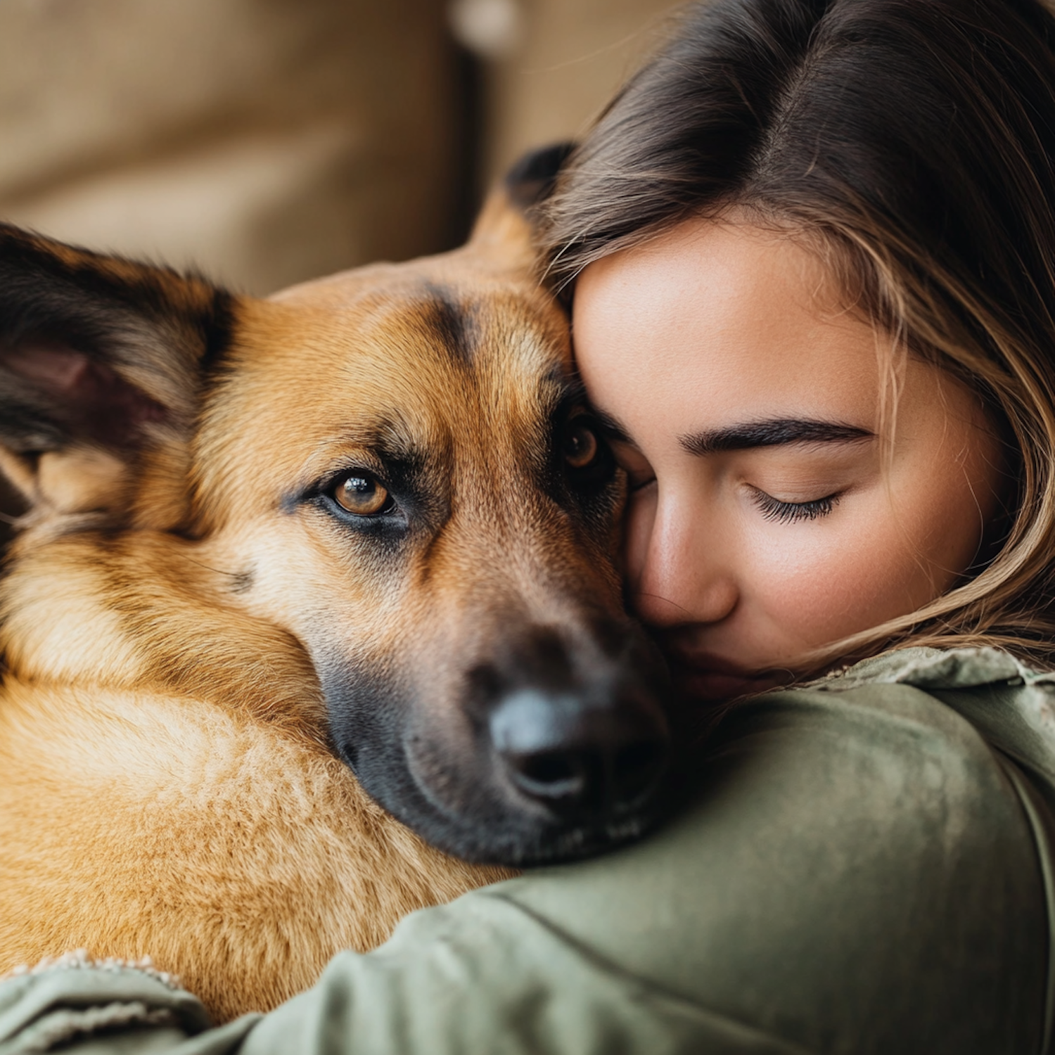 A young woman lovingly embraces her German Shepherd, eyes closed in a peaceful moment of connection and affection.