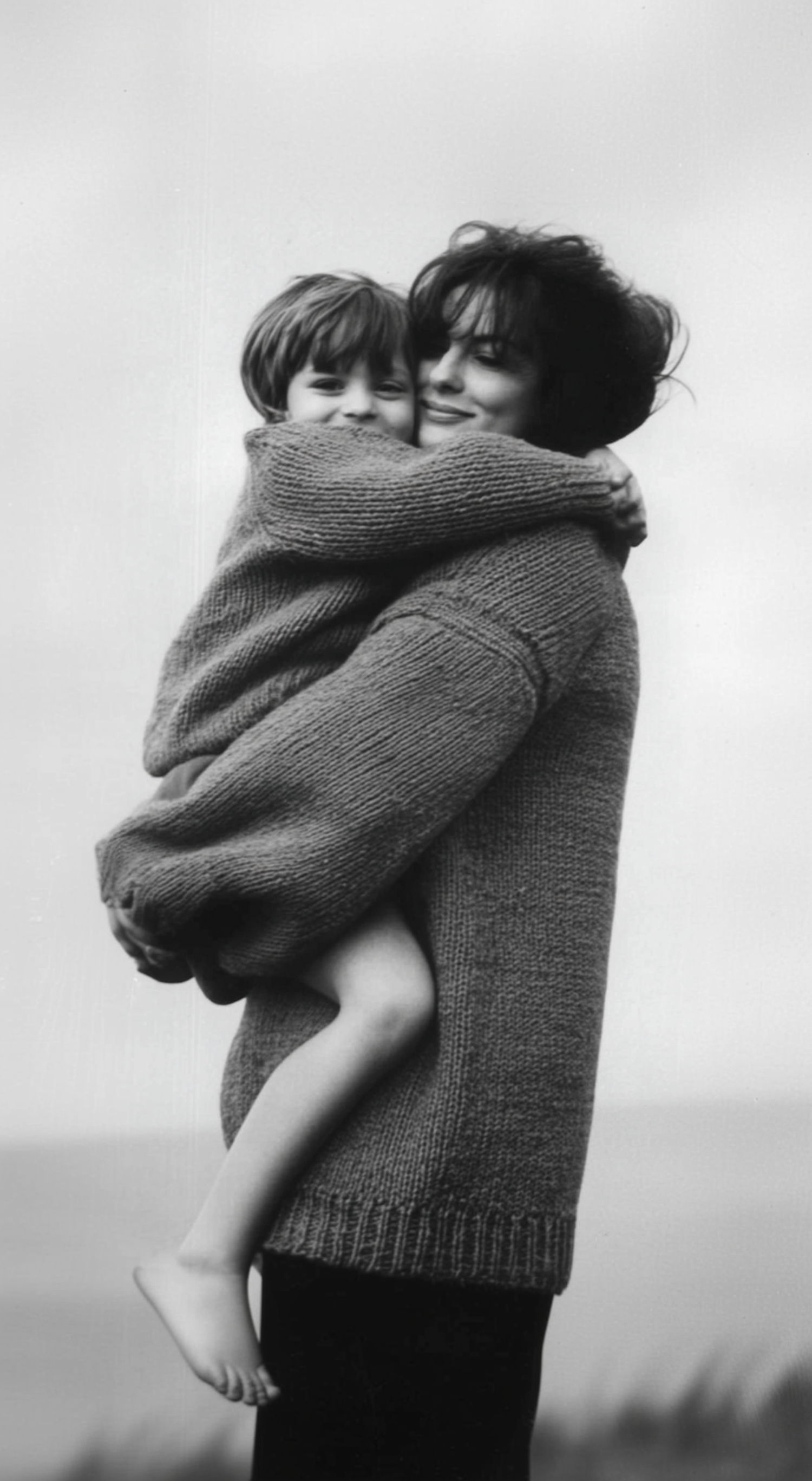 A heartwarming black-and-white photo of a woman holding a child in oversized sweaters, sharing a tender moment outdoors.
