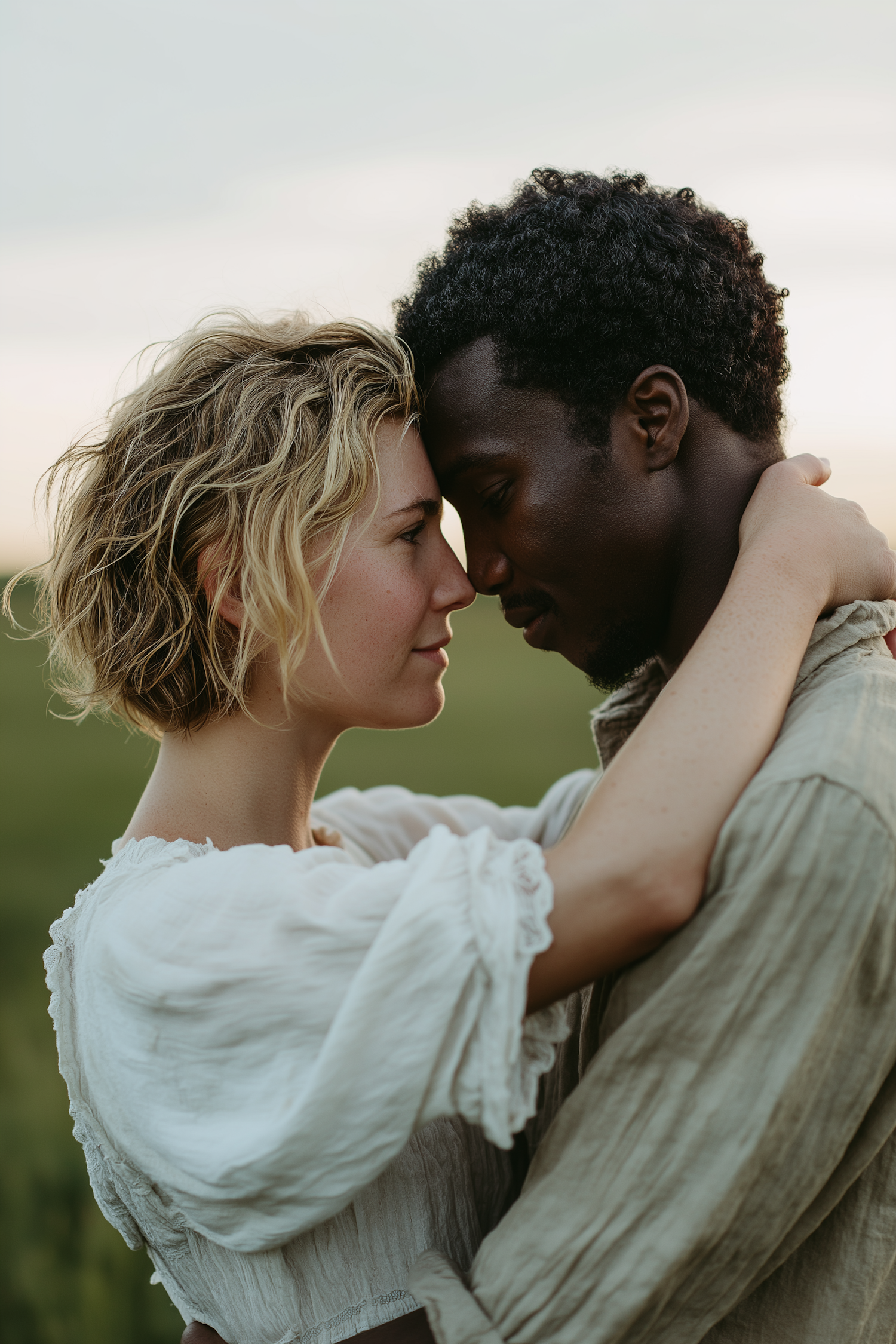 A tender moment between a couple embracing outdoors, with soft natural lighting and a serene blurred background.