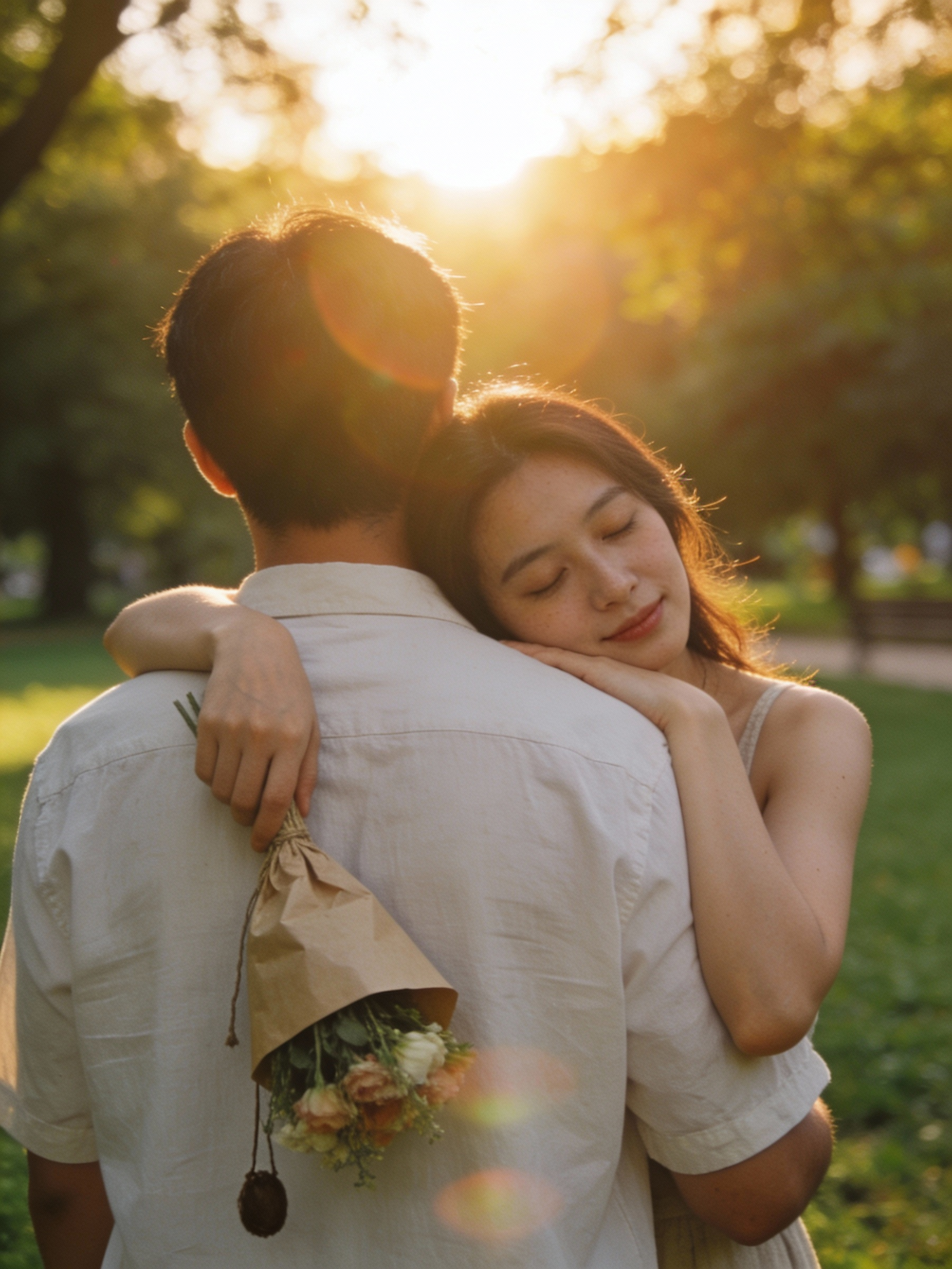 Ultra-realistic cinematic lifestyle photo, vertical 4:5. Golden hour outdoors in a quiet park, sun low behind the couple creating warm rim light. Man and woman seen from behind in a close hug, her head on his shoulder; a small bouquet wrapped in plain kraft paper hangs loosely at her side. Soft lens flare, creamy bokeh, natural posture, candid mood. 35mm look, shallow DOF, crisp details, warm highlights, premium editorial retouch, subtle film grain. Negative prompt: logos, readable text, watermark, brand labels, staged posing, cheesy props, heart confetti, HDR, oversaturation, plastic-looking skin, over-smoothing, fake skin texture, overly perfect faces, deformed hands, extra fingers, distorted anatomy, unnatural body proportions, exaggerated facial expressions, forced smiles, harsh flash, heavy vignetting, excessive lens flare, motion blur on subjects, unrealistic lighting, over-sharpening halos, noise artifacts, banding.