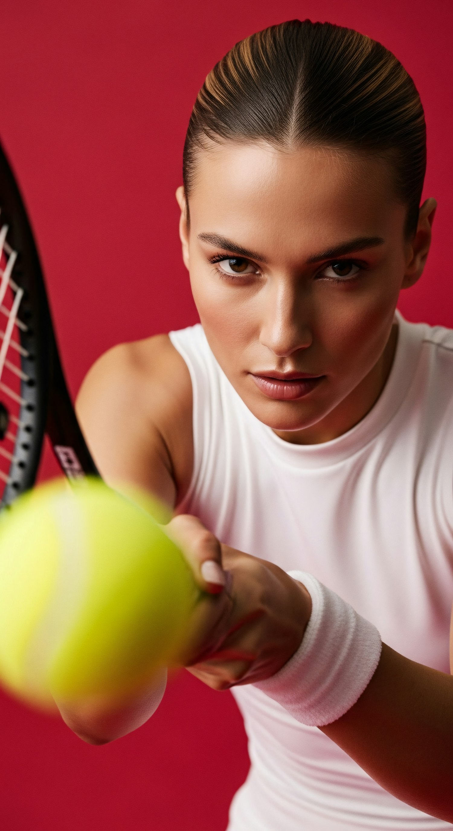 A close-up of a tennis player in action, holding a racket and focusing on a tennis ball, set against a bold red background.