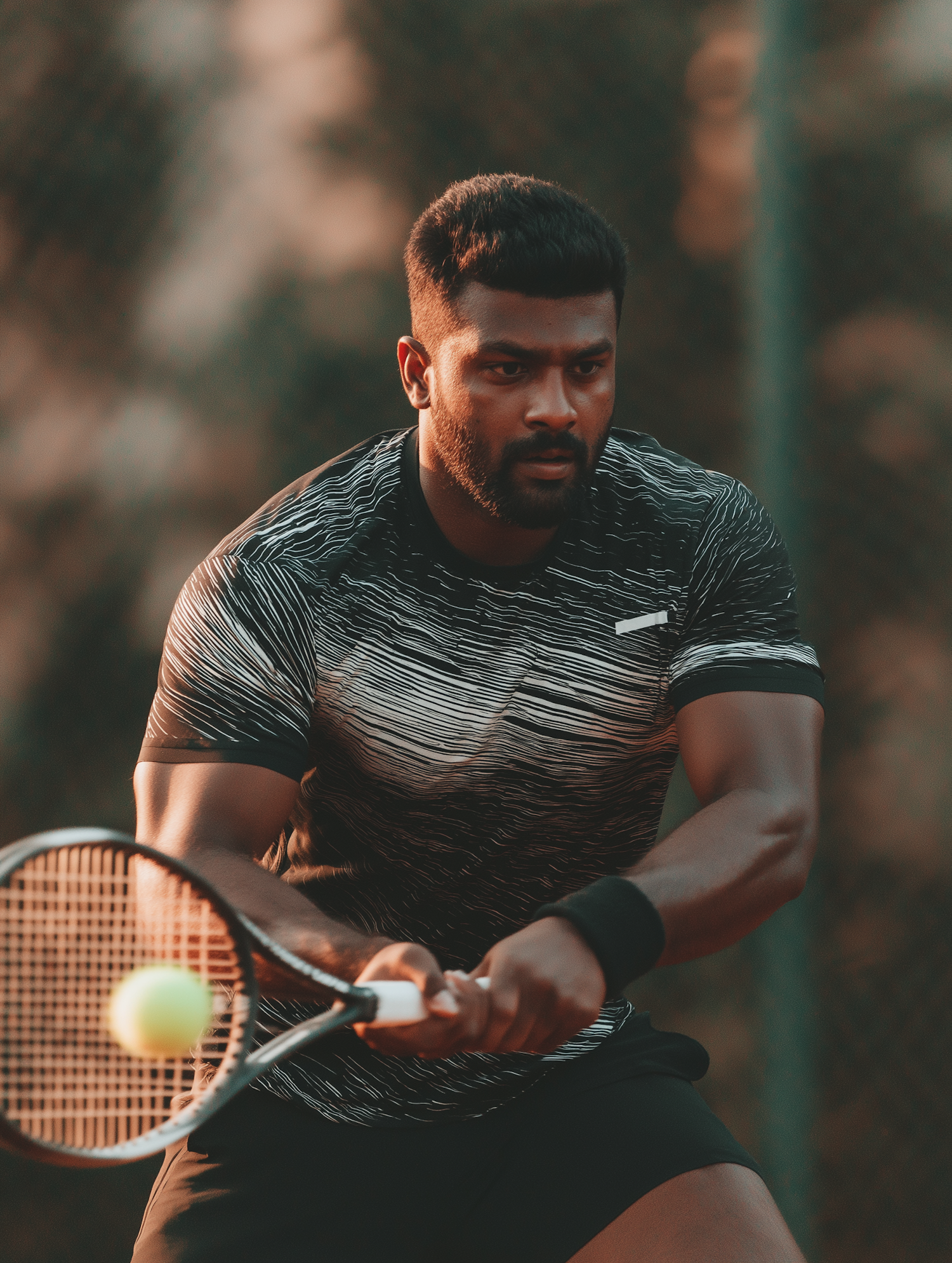 A focused tennis player in action, wearing a patterned shirt and holding a racket, with a blurred background emphasizing the motion.