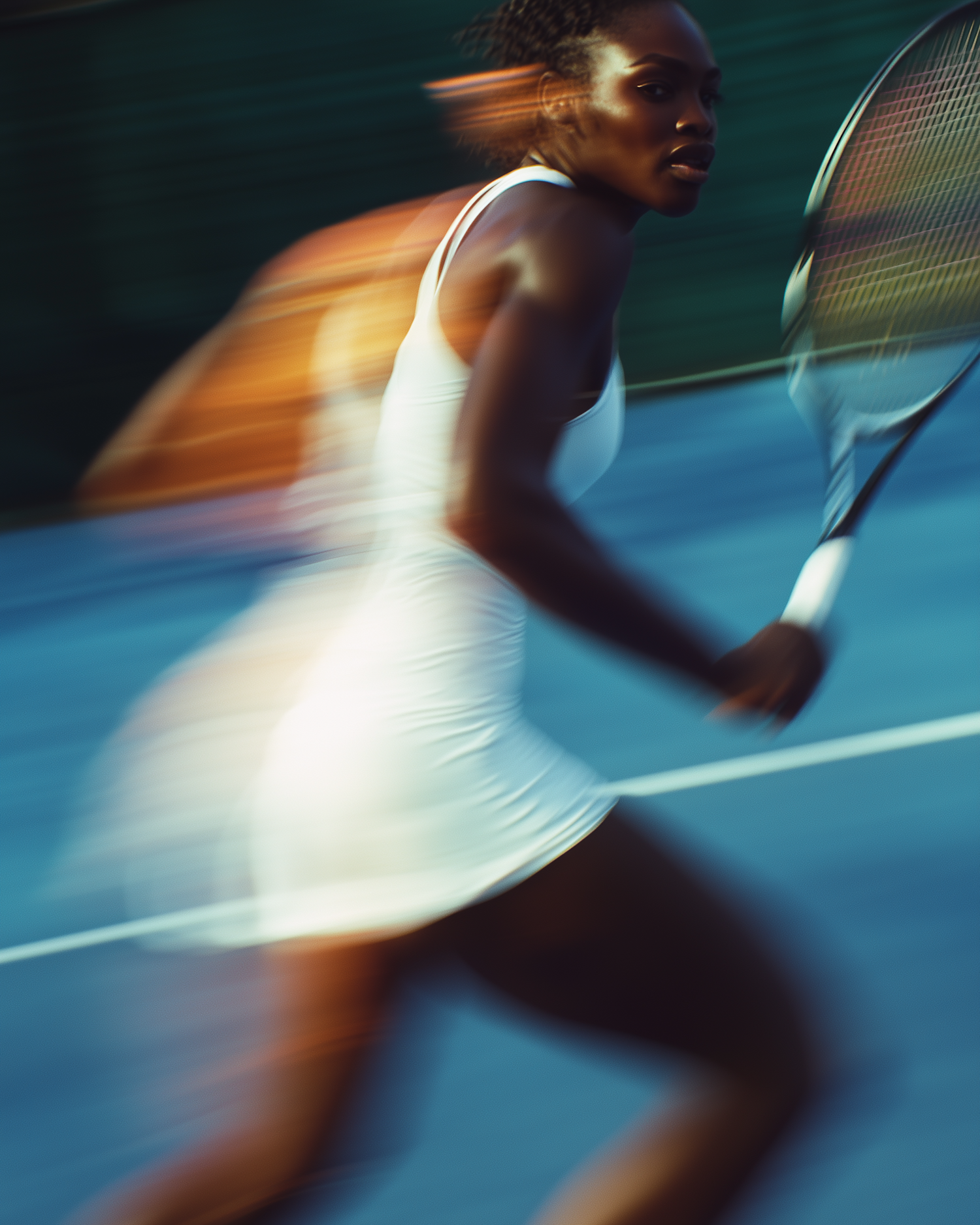A motion-blurred shot of a Black woman in a white tennis dress, showcasing speed and focus on a blue tennis court.