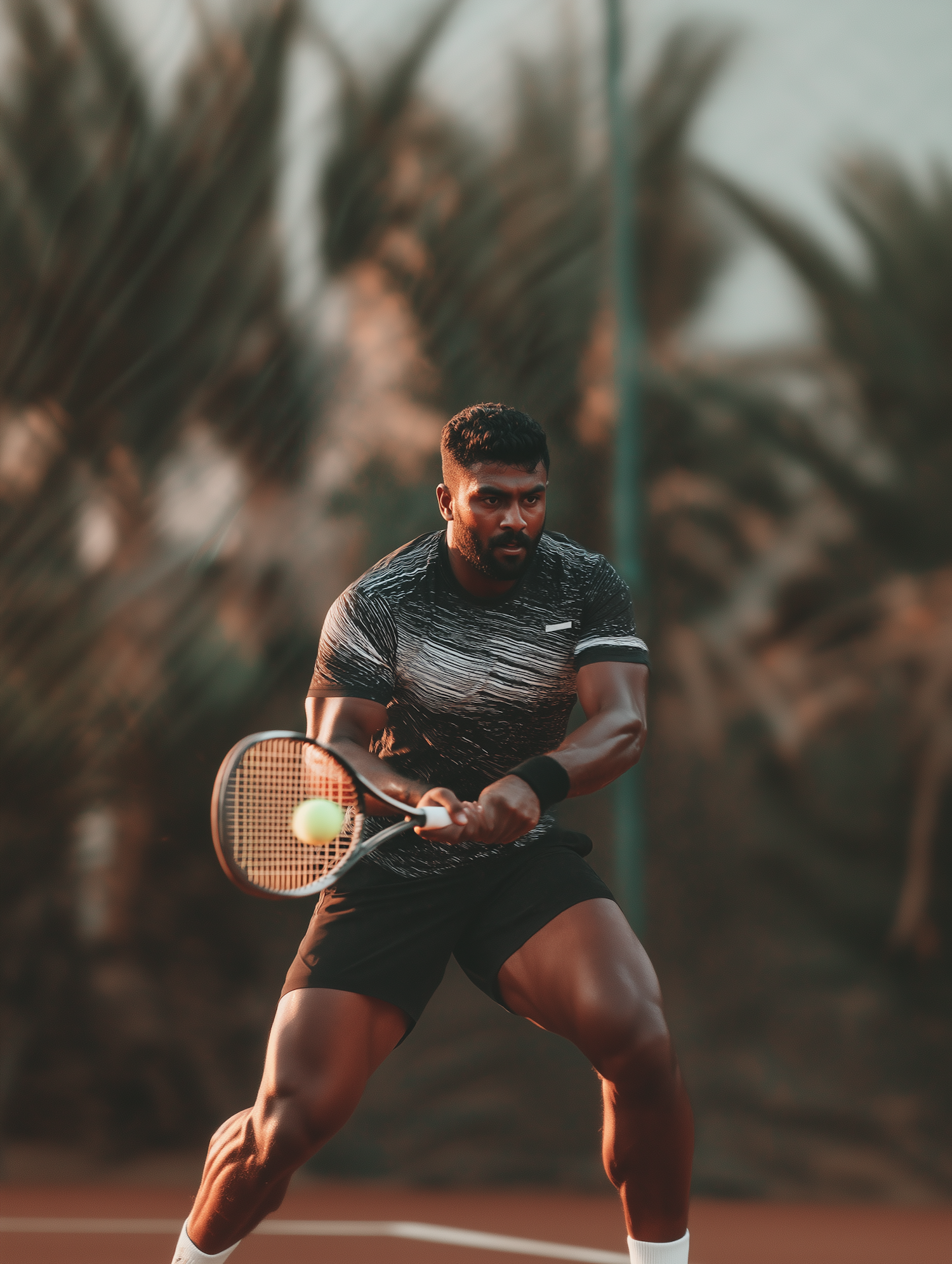 A focused tennis player in action, preparing to return a shot on an outdoor court, with blurred greenery in the background.