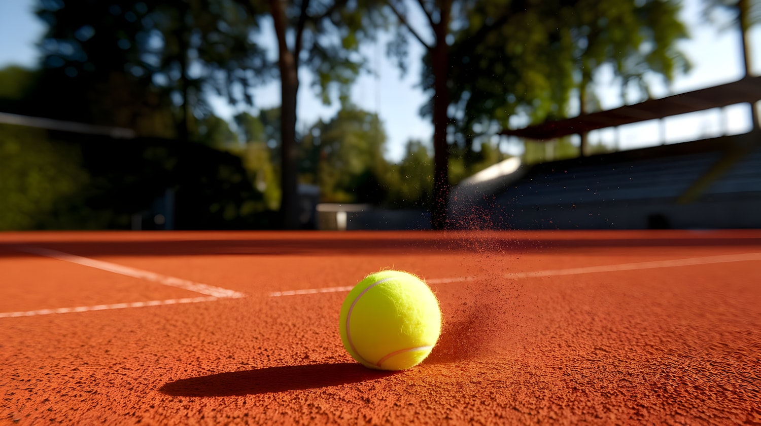 Close-up of a tennis ball on a red clay court, with dust particles rising and sunlight casting a shadow. Perfect for sports or tennis themes.