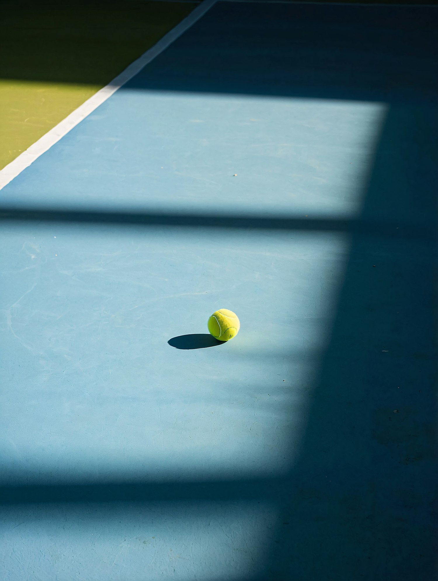 A bright yellow tennis ball on a blue court with dramatic shadows and a green section in the background. Minimalist sports aesthetic.