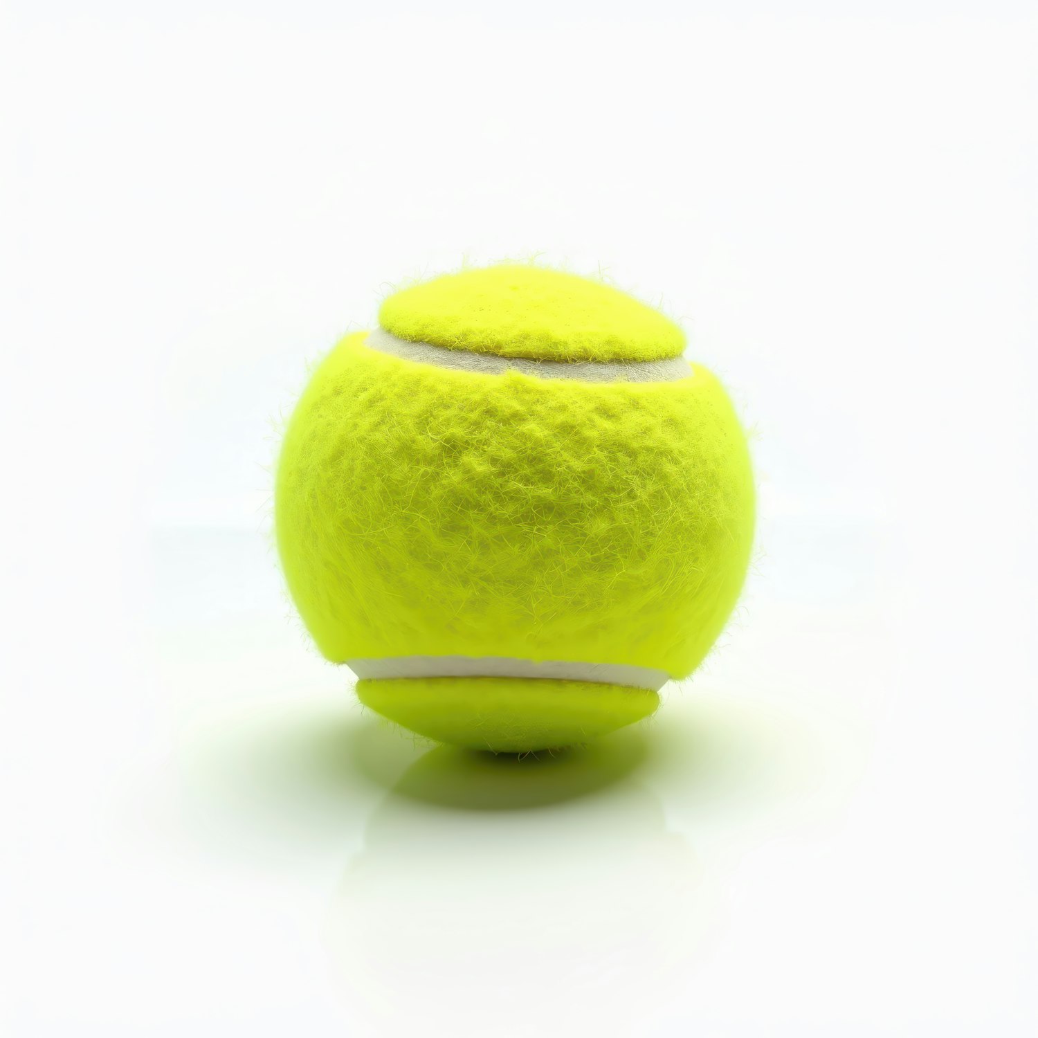 Close-up of a bright yellow tennis ball with a fuzzy texture and white seams, set against a clean white background.