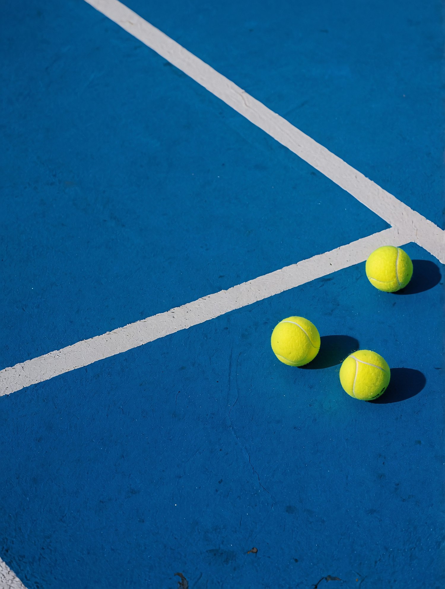 Three yellow tennis balls on a vibrant blue court with white lines, creating a bold and colorful sports-themed composition.
