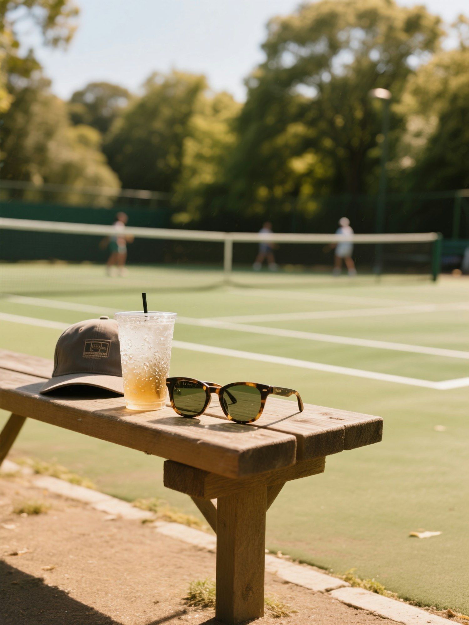 A sunny day at the tennis court with a bench holding sunglasses, a cap, and iced tea, while players enjoy a match in the background.