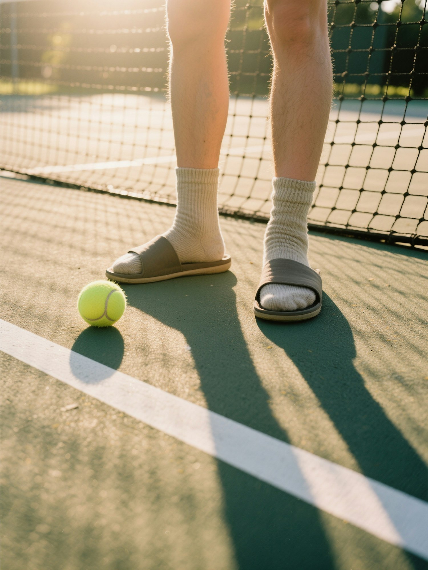 Close-up of legs in socks and sandals on a tennis court with a tennis ball nearby, bathed in warm sunlight.