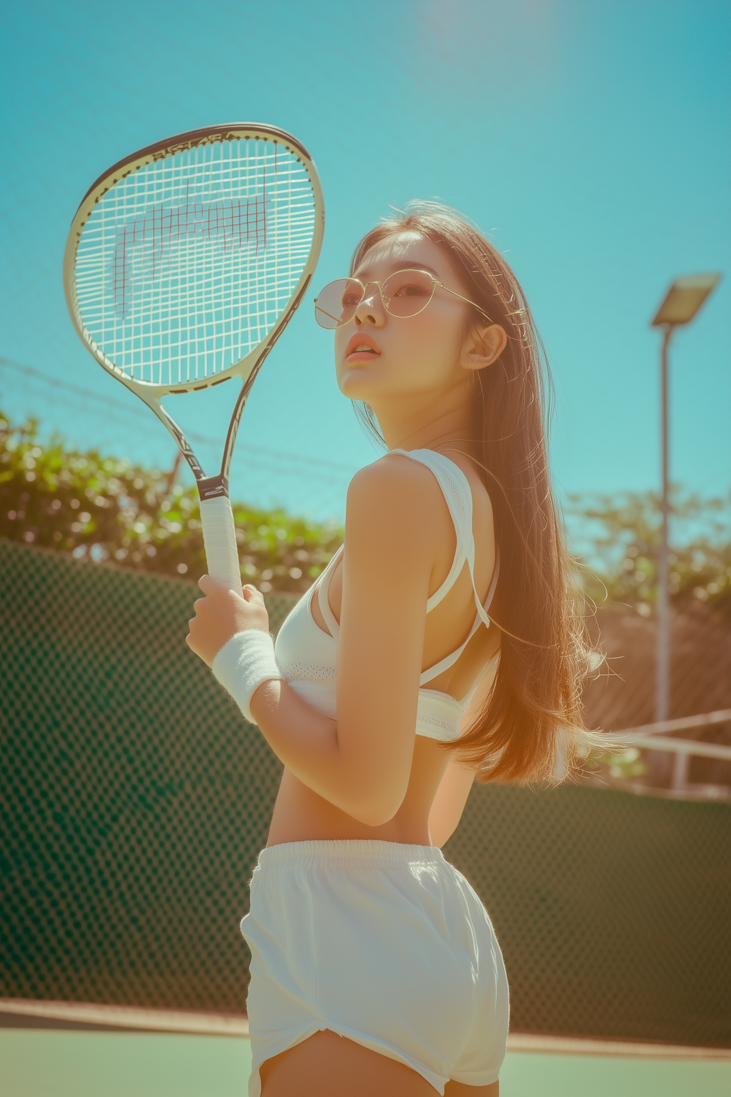 Stylish young woman on a tennis court in sporty white attire, holding a racket under a bright blue sky. Perfect summer vibes.