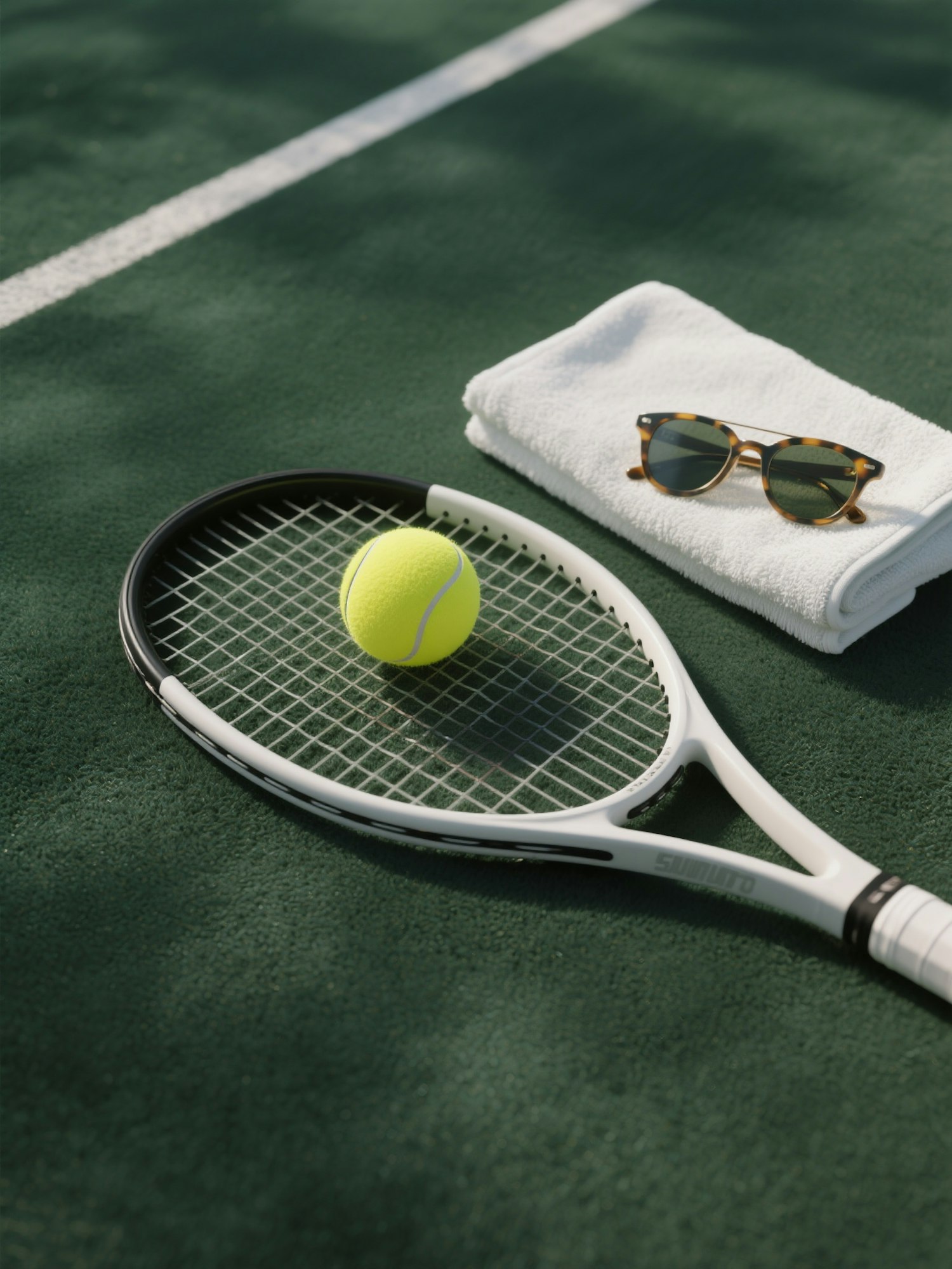 Tennis essentials on a sunny day: racket, ball, towel, and sunglasses on a green court. Perfect for a stylish match or practice.