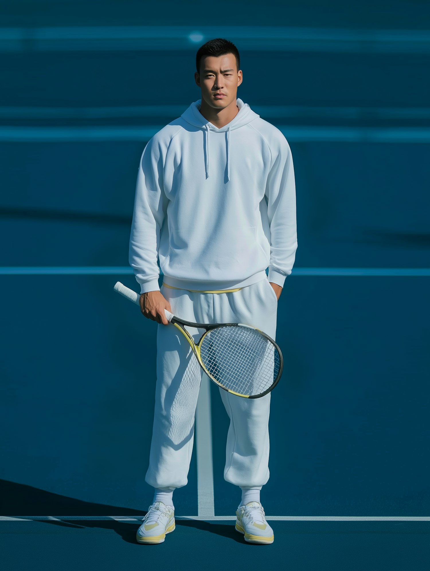 A man in white sportswear holding a tennis racket stands on a blue tennis court, creating a striking contrast.