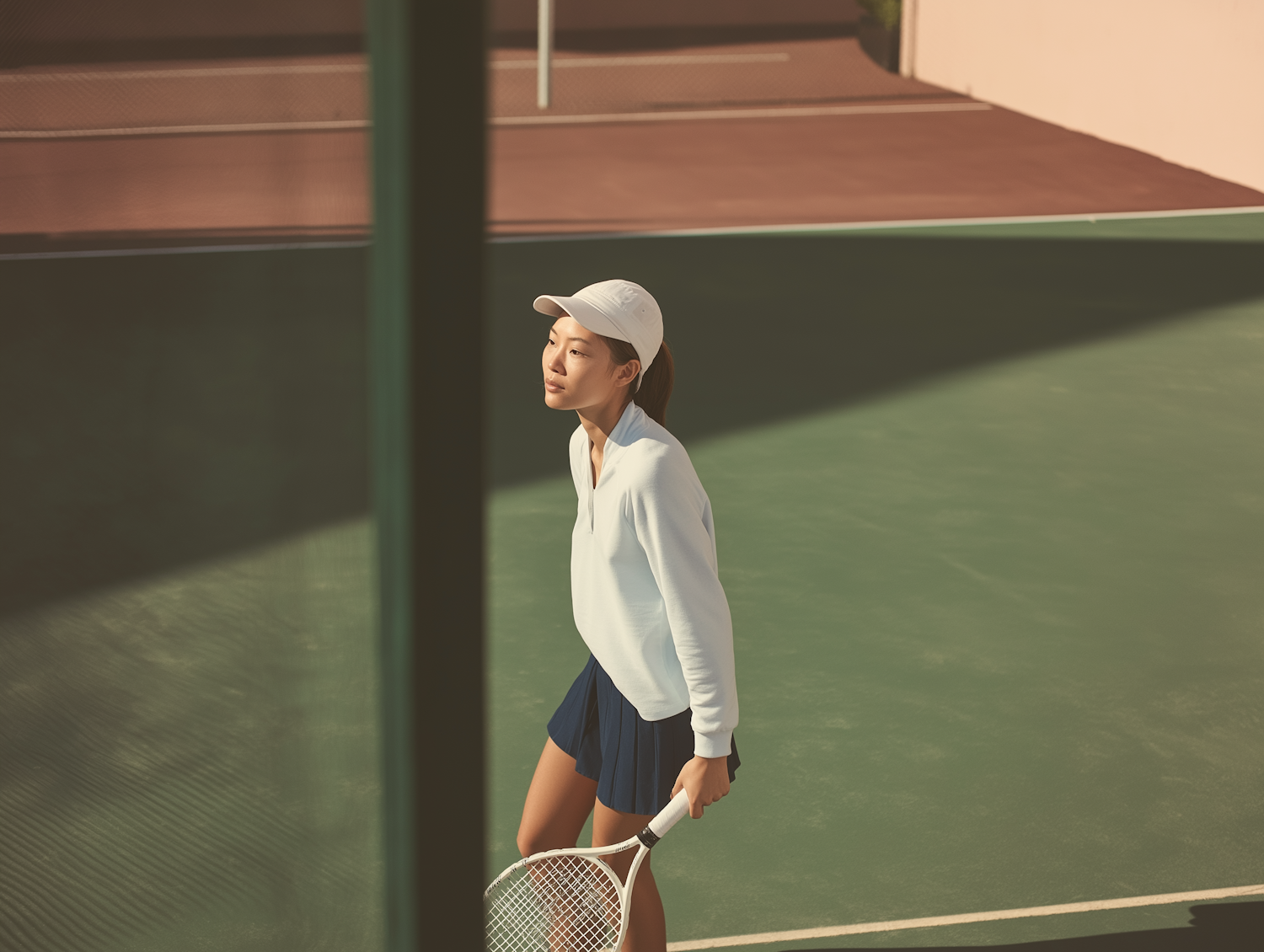 A young woman in a white cap and sporty outfit stands on a sunlit tennis court, holding a racket and looking focused.
