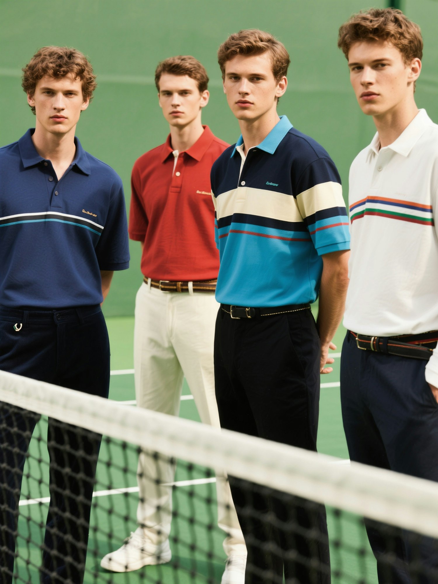 Four young male models in a retro-sporty shirts with high-end fashion editorial on a green court, focused expression, ,fashion photography, no racket, the mood is retro-sporty and clean --sref 3721090848 --sref 2560033873