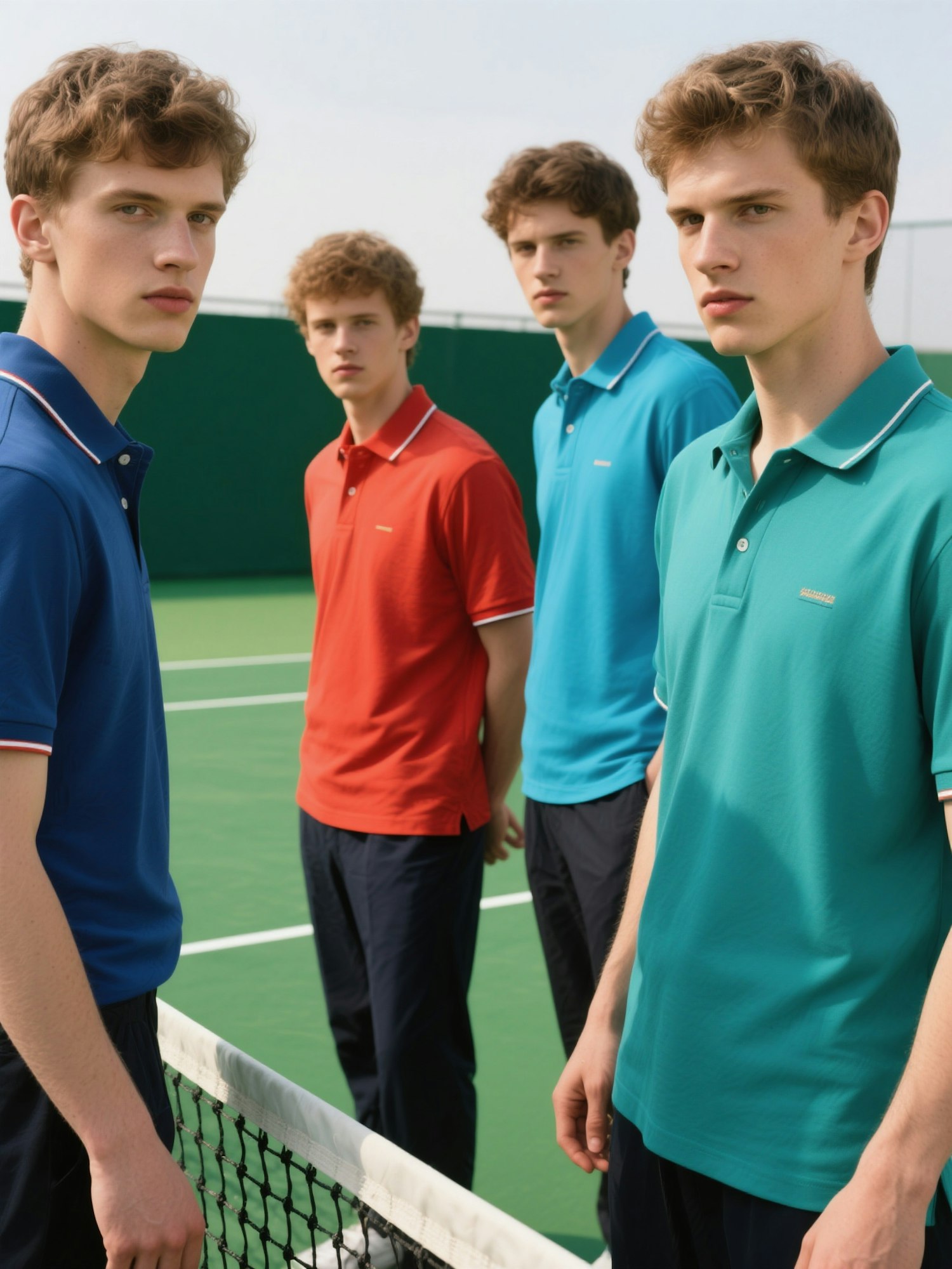Four young men in colorful polo shirts stand on a tennis court, creating a casual yet stylish outdoor scene.