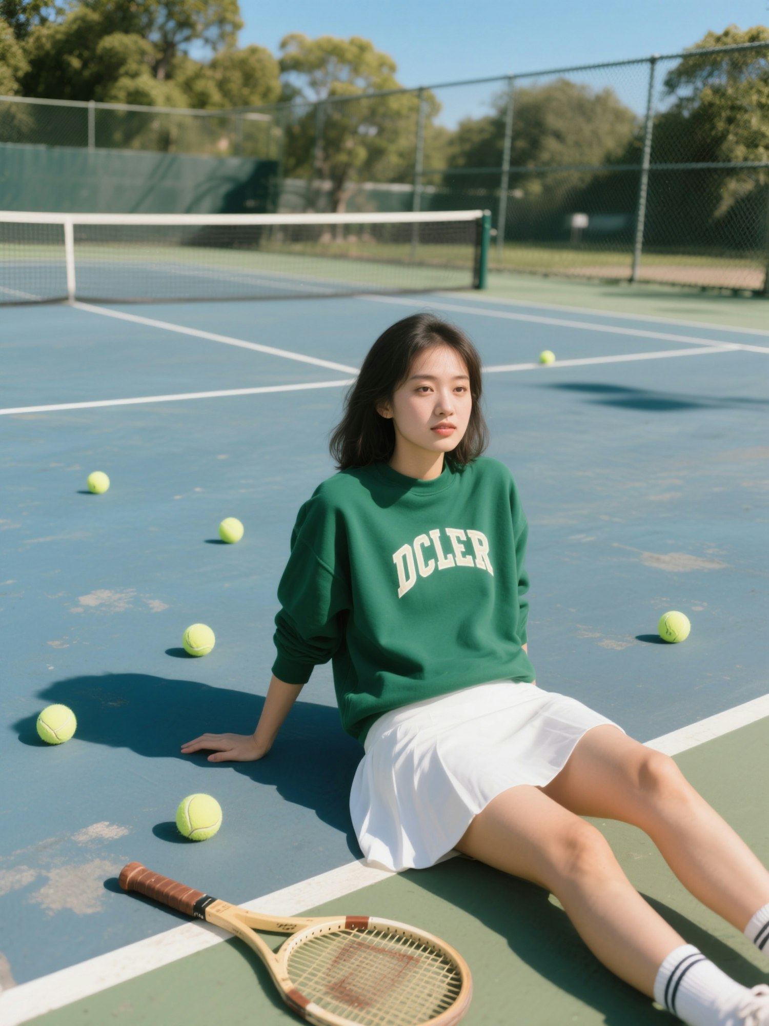A young woman in a green sweatshirt and white skirt sits on a tennis court with tennis balls and a racket nearby, under a sunny sky.