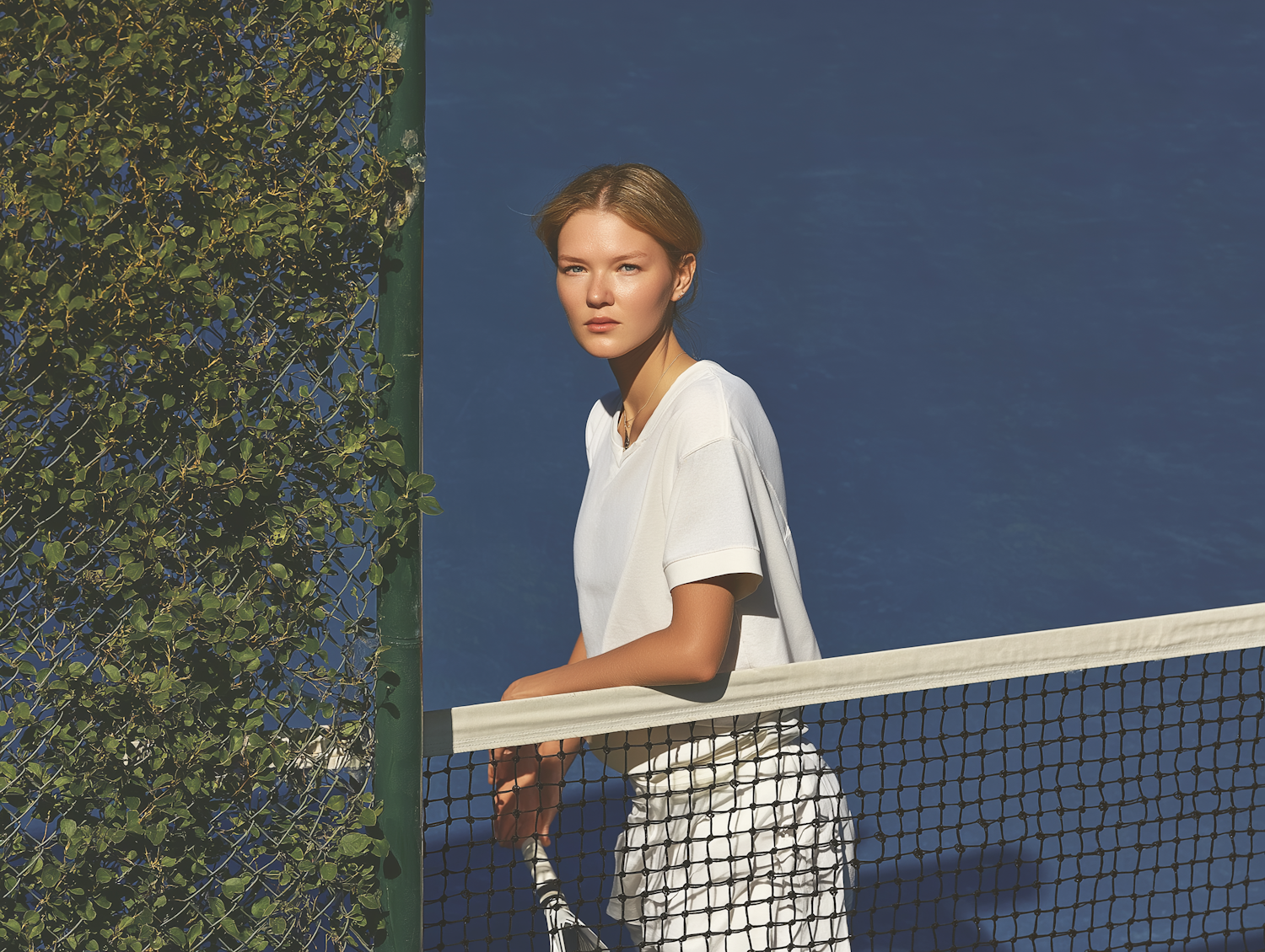 A young woman in white sportswear leans on a tennis net, holding a racket, with a blue court and greenery in the background.