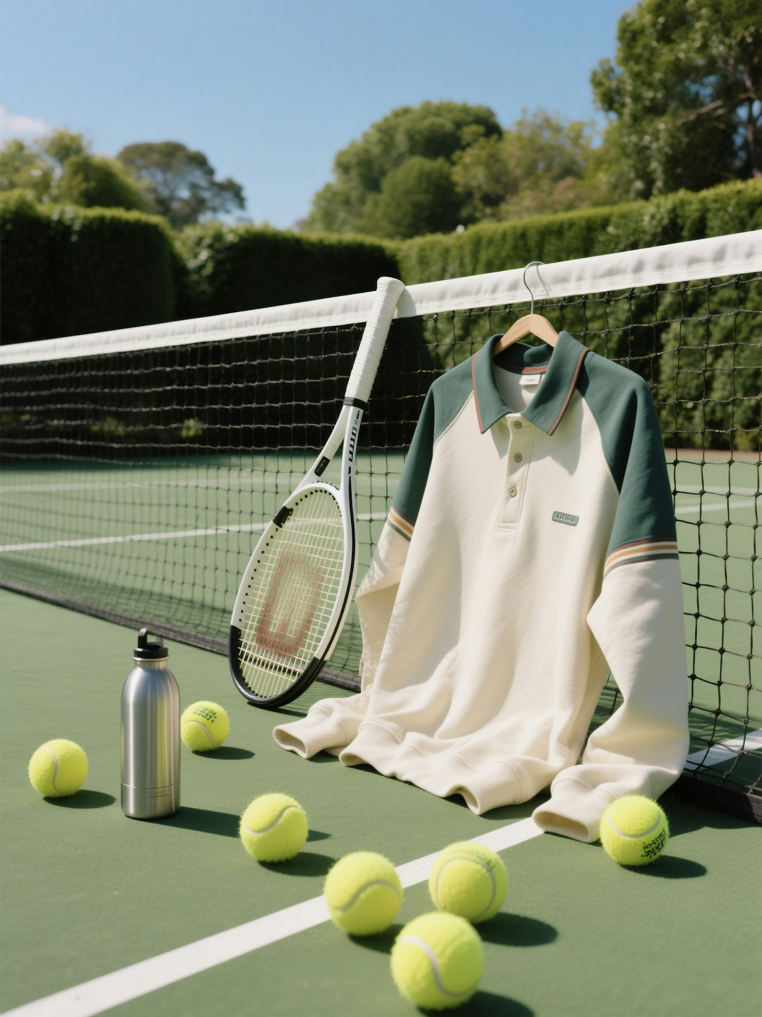 Tennis court setup with a stylish polo shirt, racket, and balls under a sunny sky. Perfect for sports enthusiasts and casual fashion lovers.