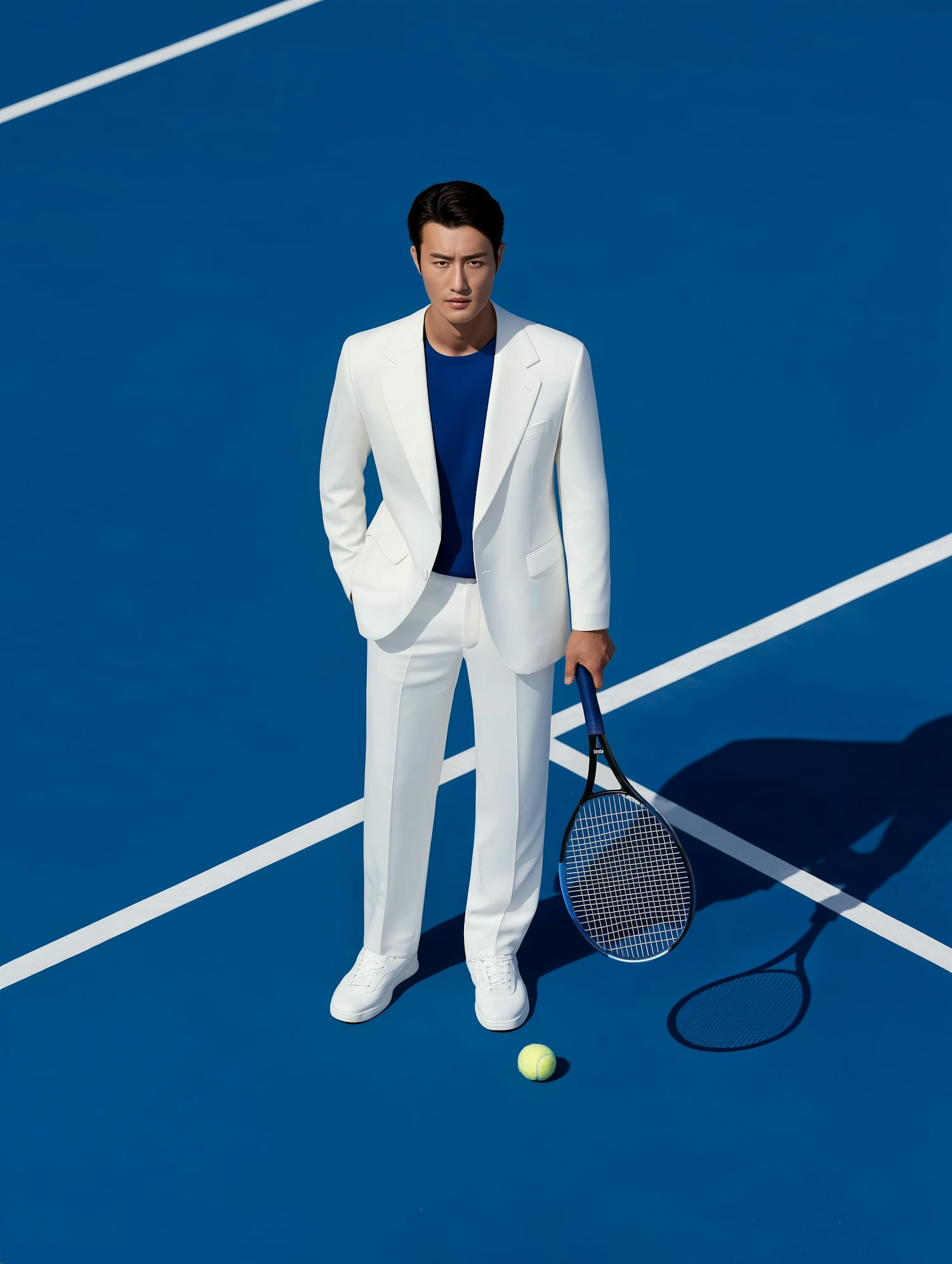 A man in a white suit with a blue shirt stands on a blue tennis court, holding a racket with a ball nearby, creating a striking visual.