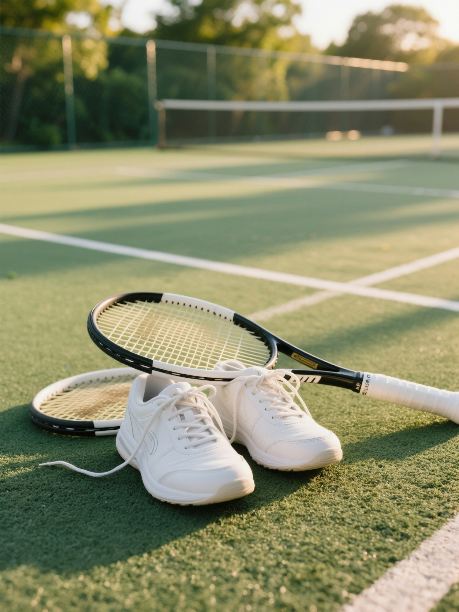 White tennis shoes and rackets on a sunlit green court, with a net and trees in the background, evoking a peaceful sports setting.