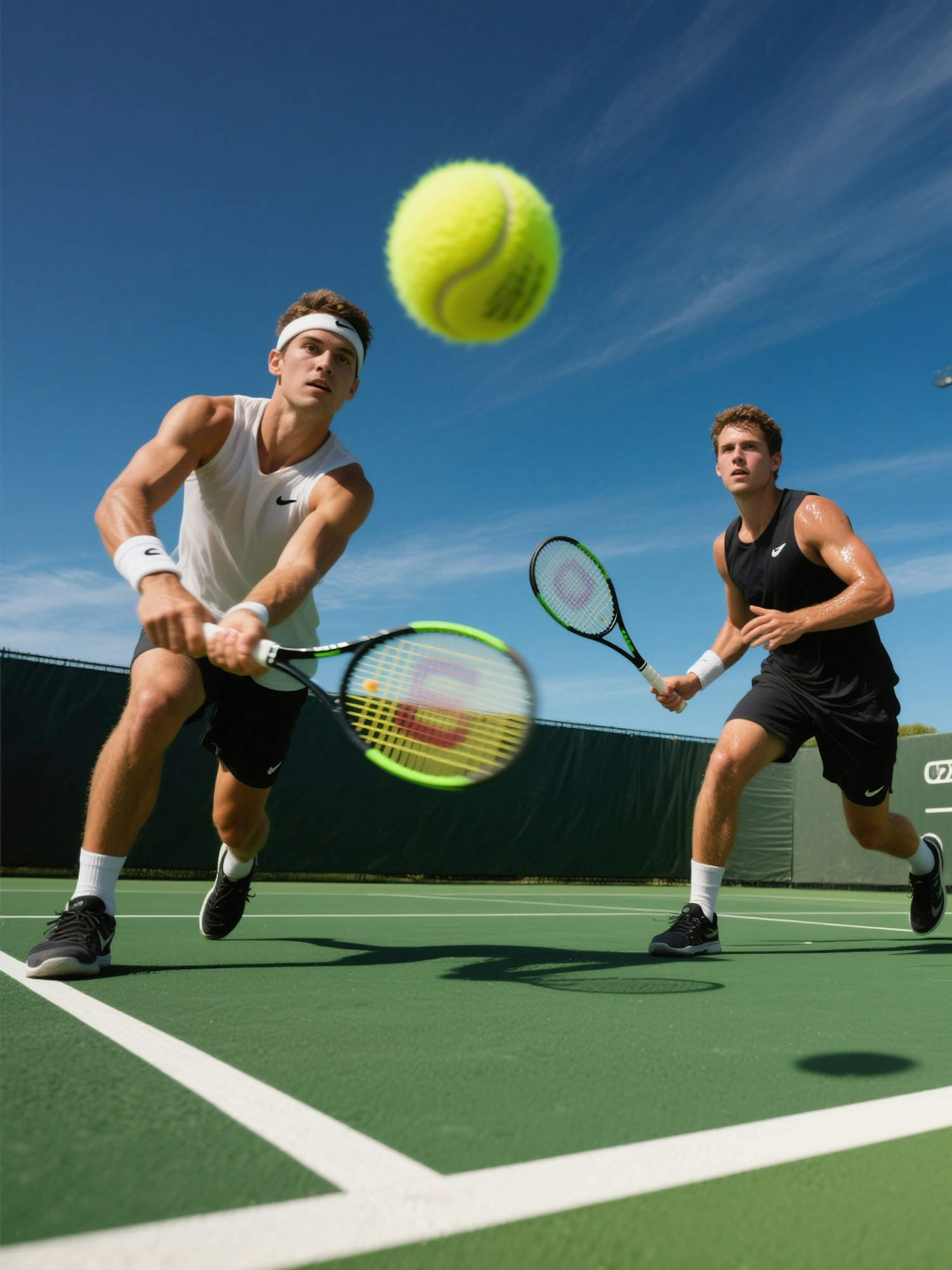 Two athletes in action on a tennis court, focusing on a bright yellow ball under a clear blue sky. Dynamic and energetic sports moment.