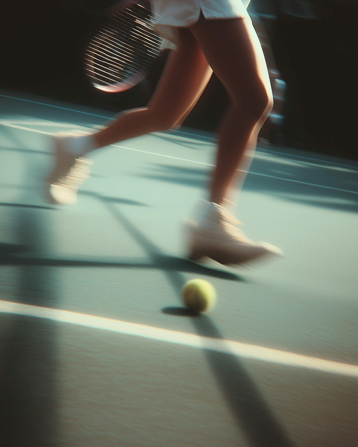 Blurred motion of a tennis player on a court, featuring a rolling tennis ball, active legs in white shoes, and a racket handle.
