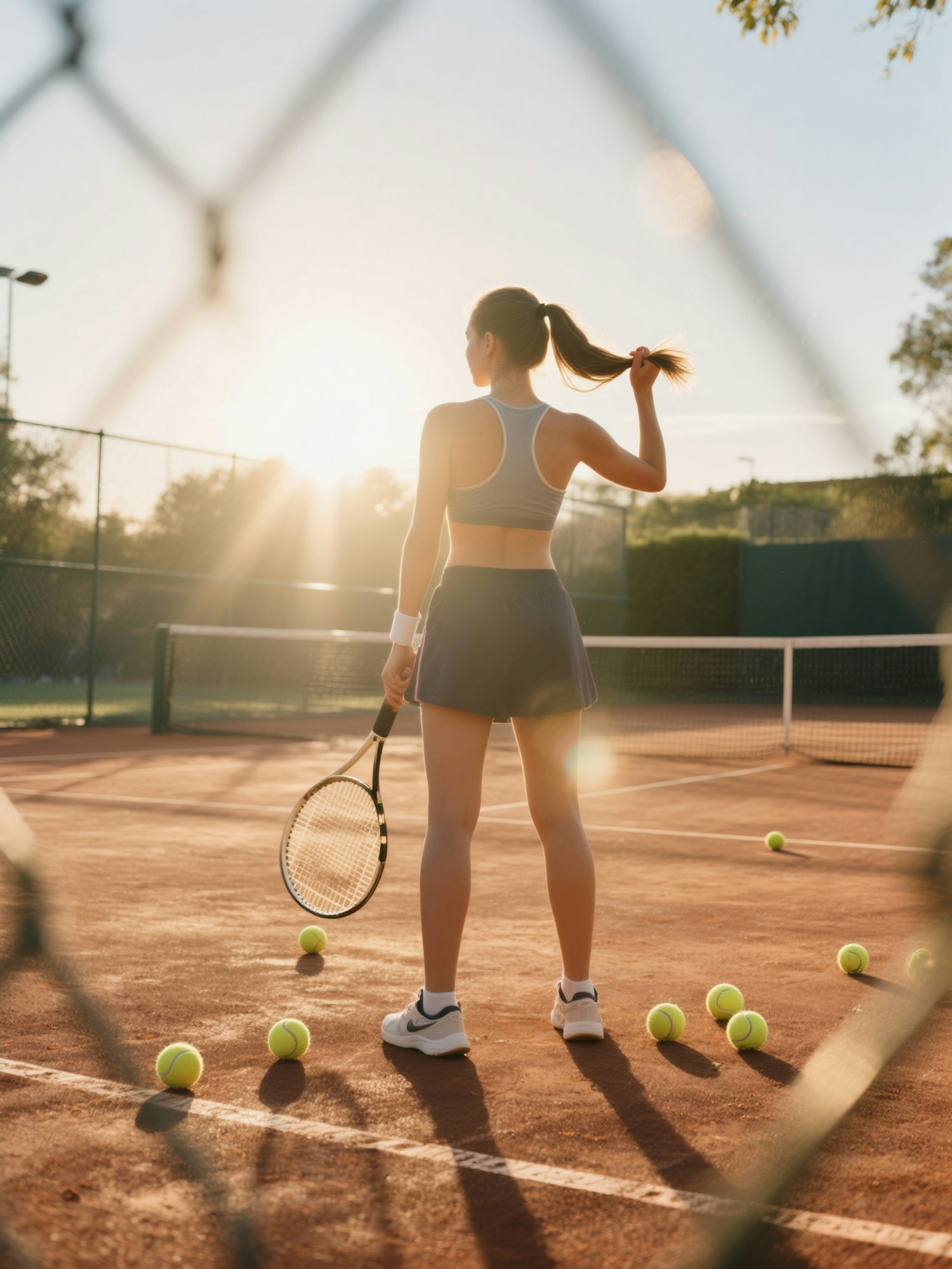 A woman on a tennis court at sunset, holding a racket and surrounded by tennis balls, framed through a chain-link fence.