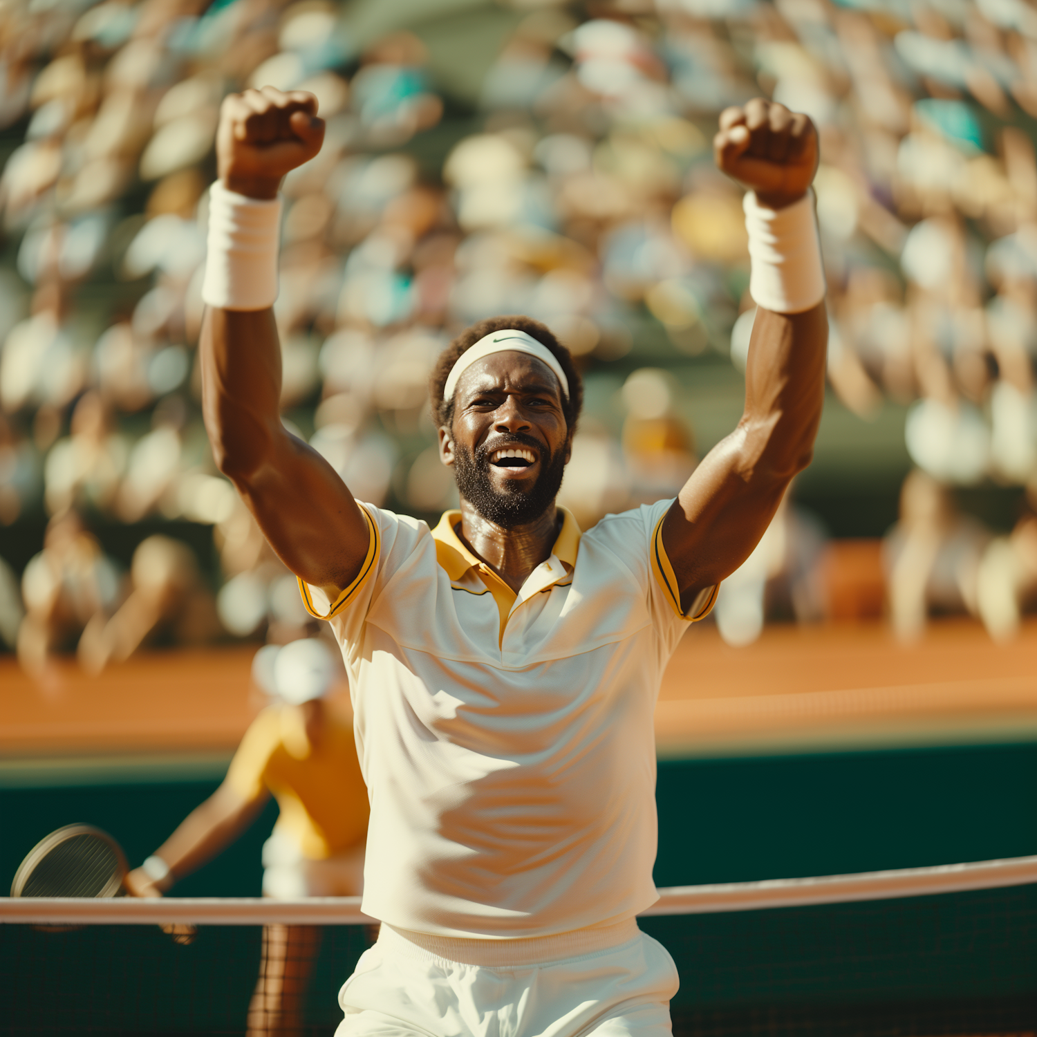 Triumphant tennis player celebrates victory on the court, arms raised, in front of a cheering crowd.