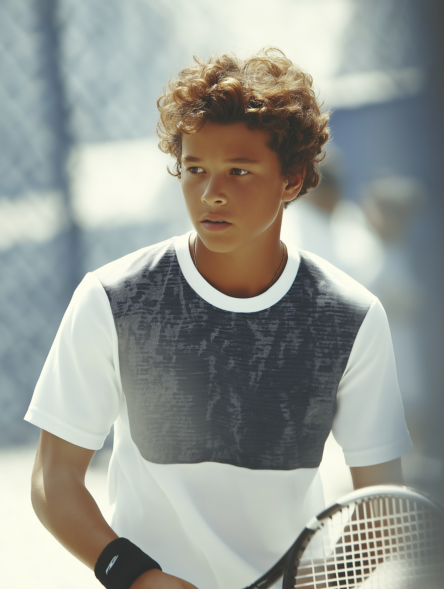 A young tennis player with curly hair and a focused expression, holding a racket on a sunny outdoor court.