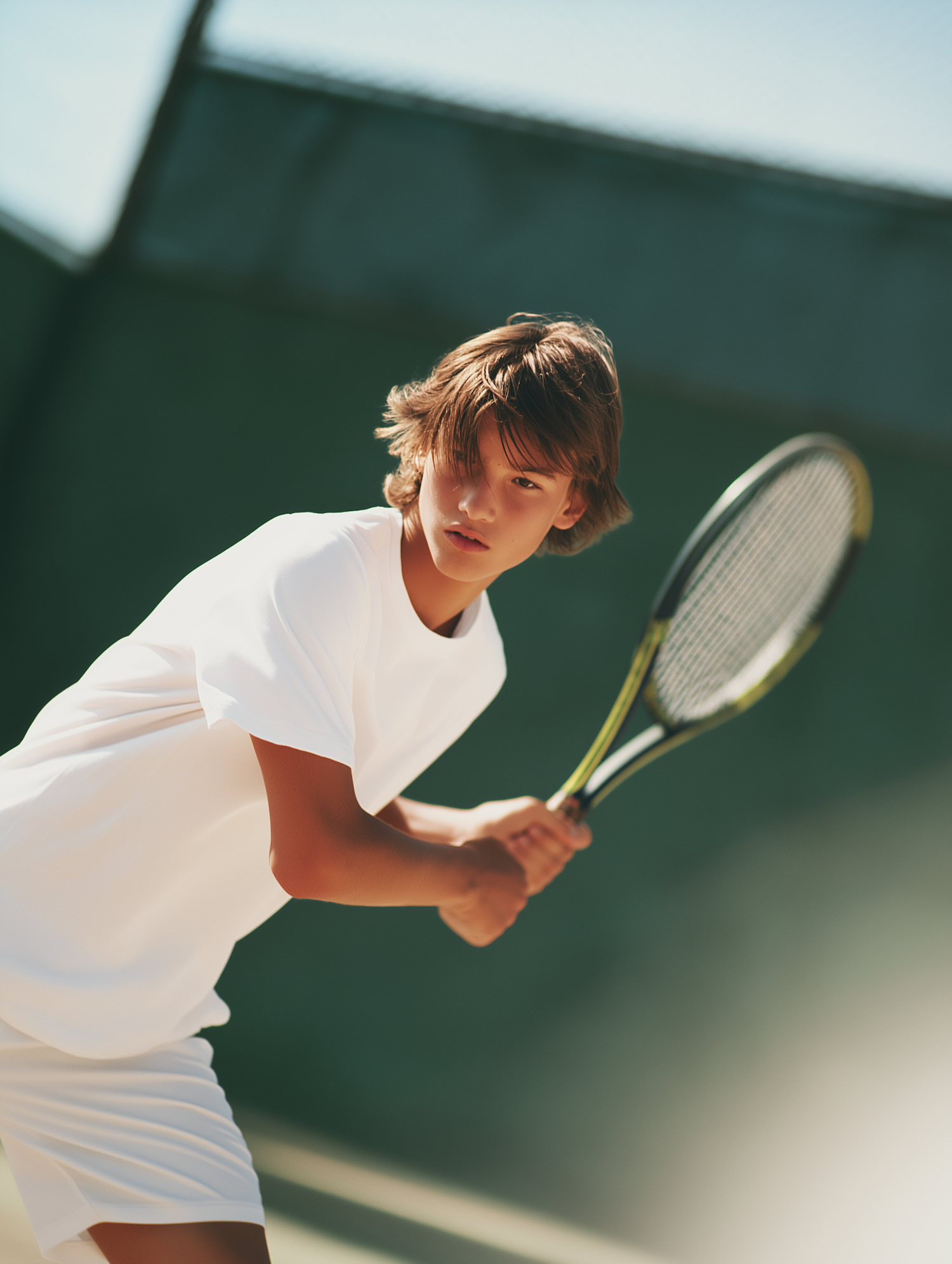 A young tennis player in white sportswear prepares for a shot on a sunny outdoor court, showcasing focus and athleticism.