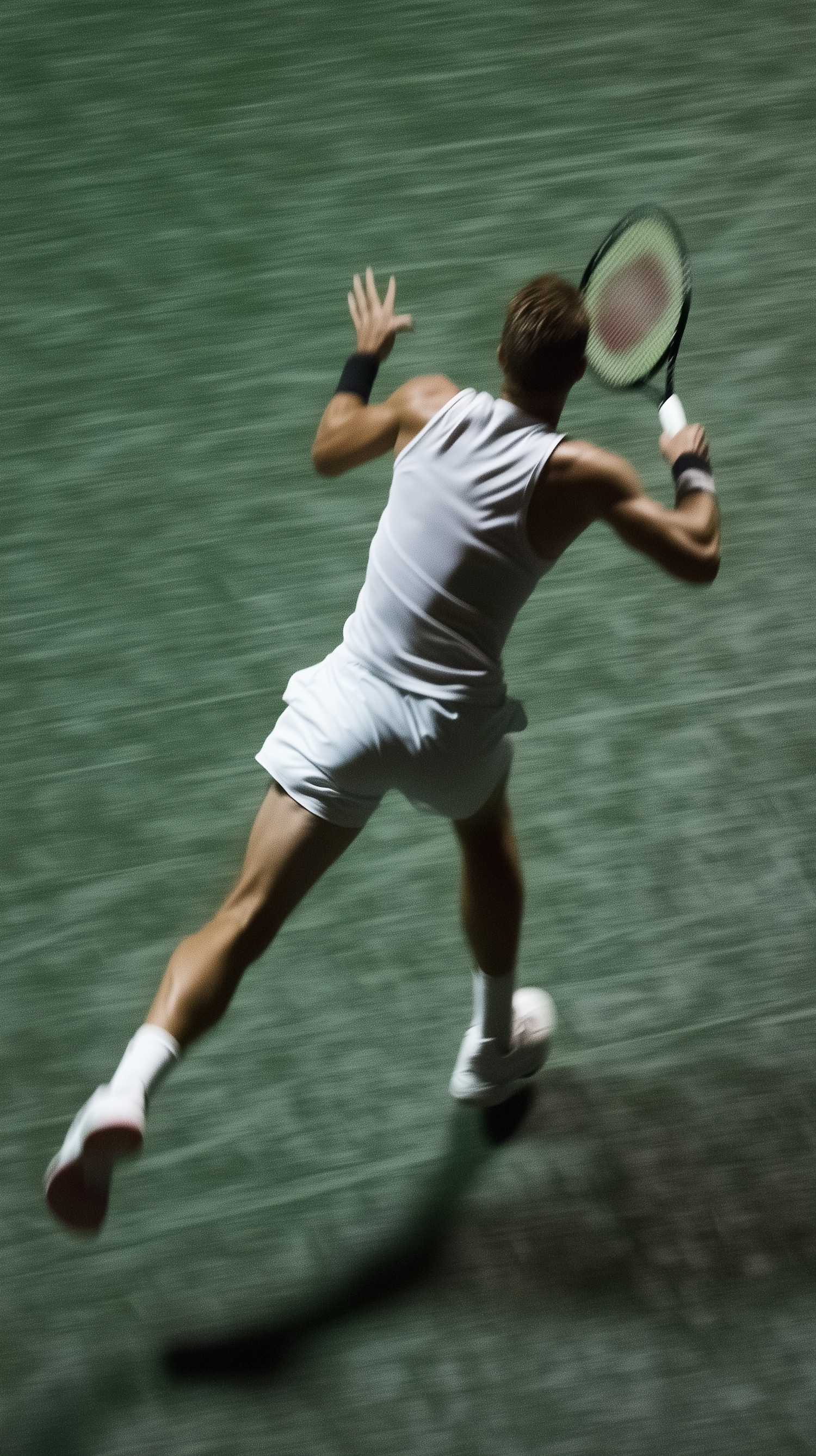 Dynamic action shot of a tennis player serving on a green court, showcasing athleticism and motion blur.
