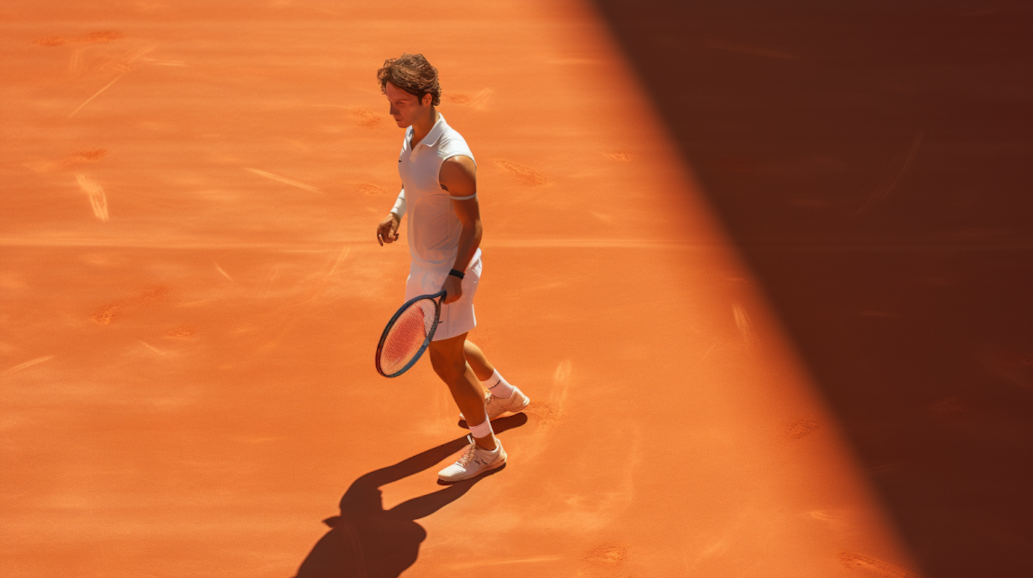 Tennis player on a sunlit clay court, wearing white attire and holding a racket, casting a shadow on the vibrant orange surface.