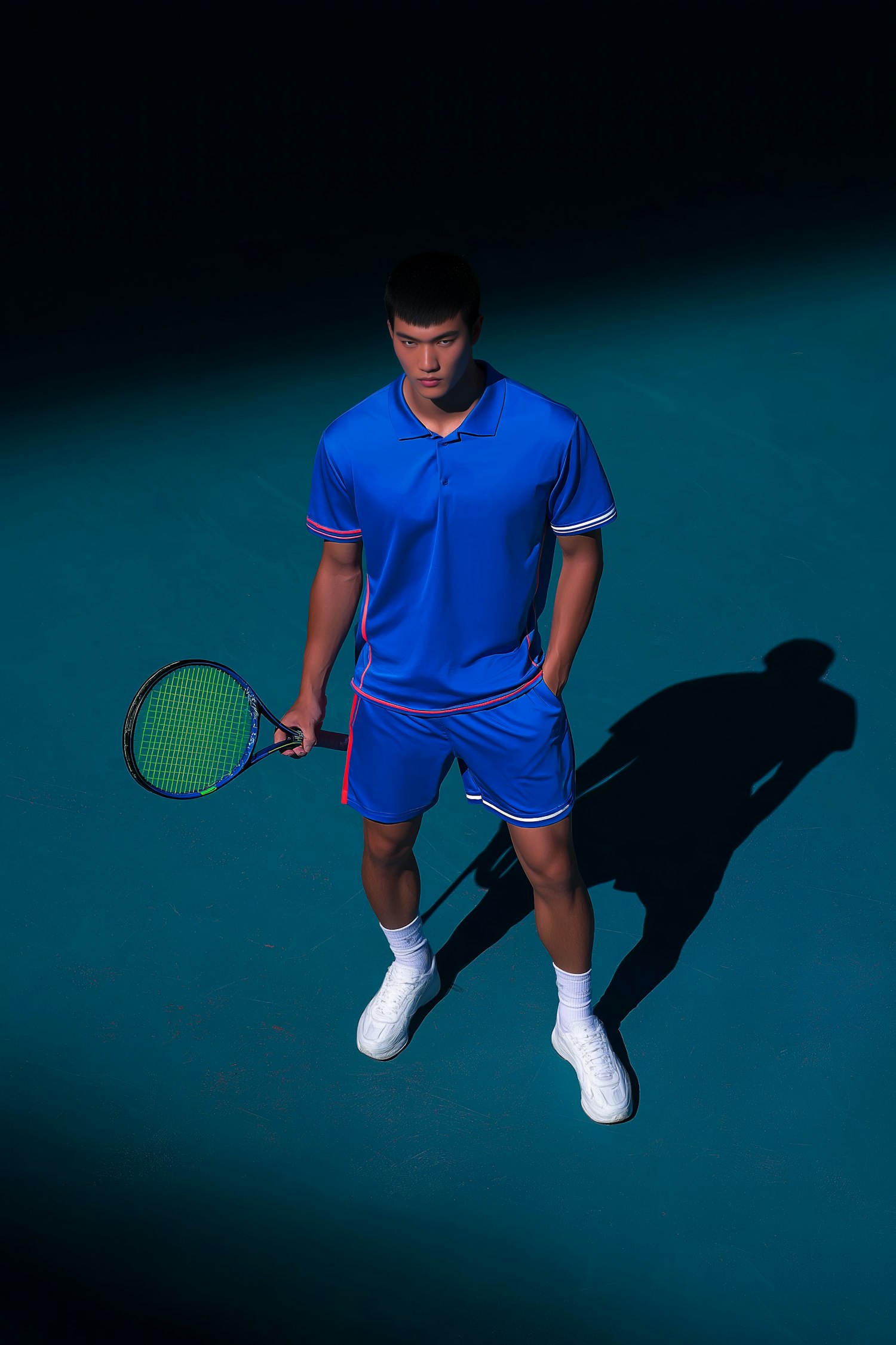 A tennis player in a blue outfit stands on a green court, holding a racket, with dramatic lighting and shadows enhancing the scene.