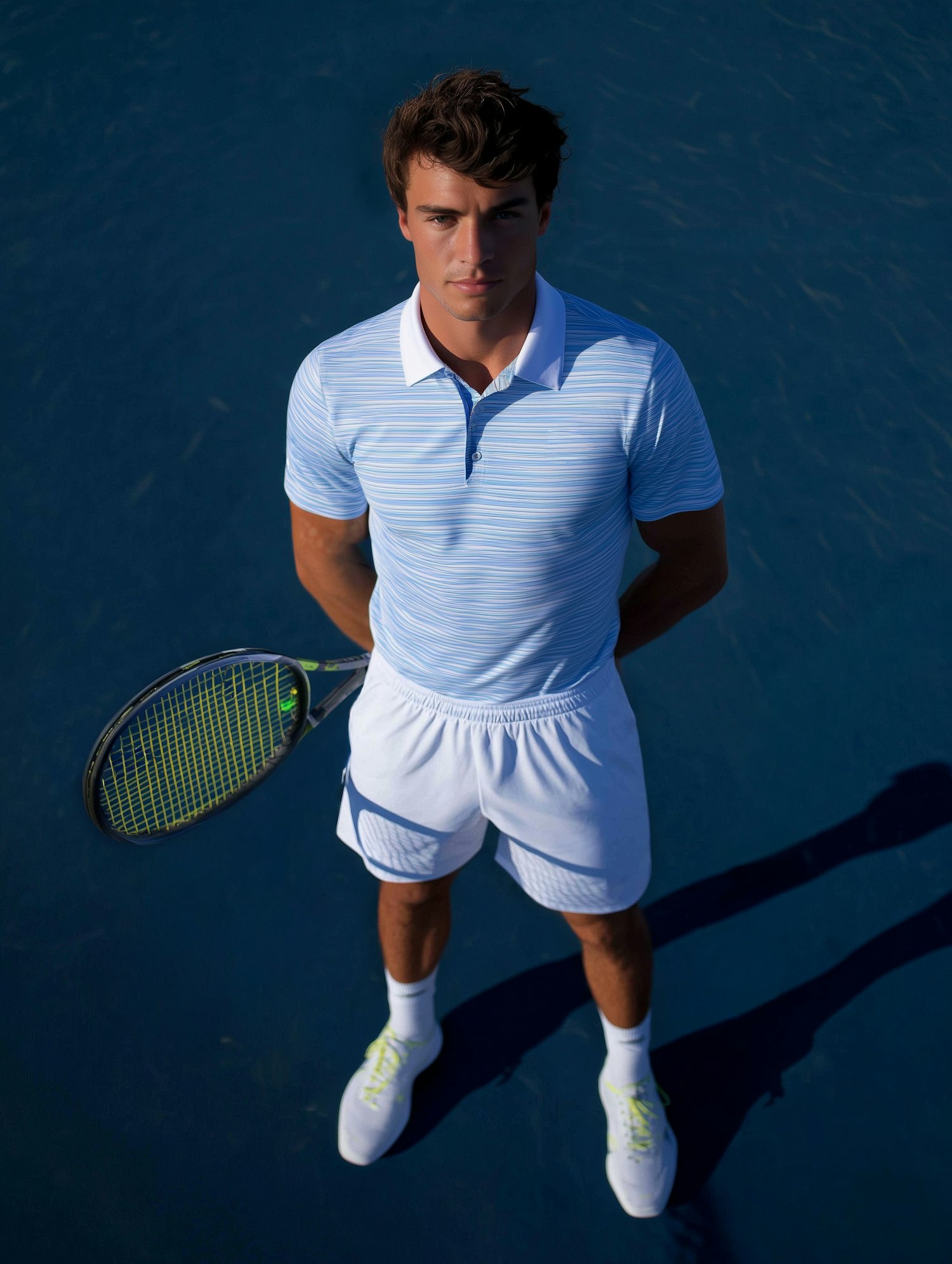 A young man in a light blue polo and white shorts stands on a tennis court holding a racket, exuding a sporty and focused vibe.