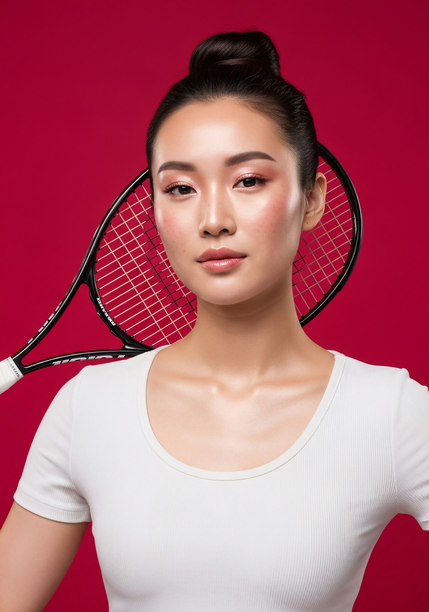 A confident woman with a tennis racket poses against a red background, showcasing a sporty and elegant vibe.