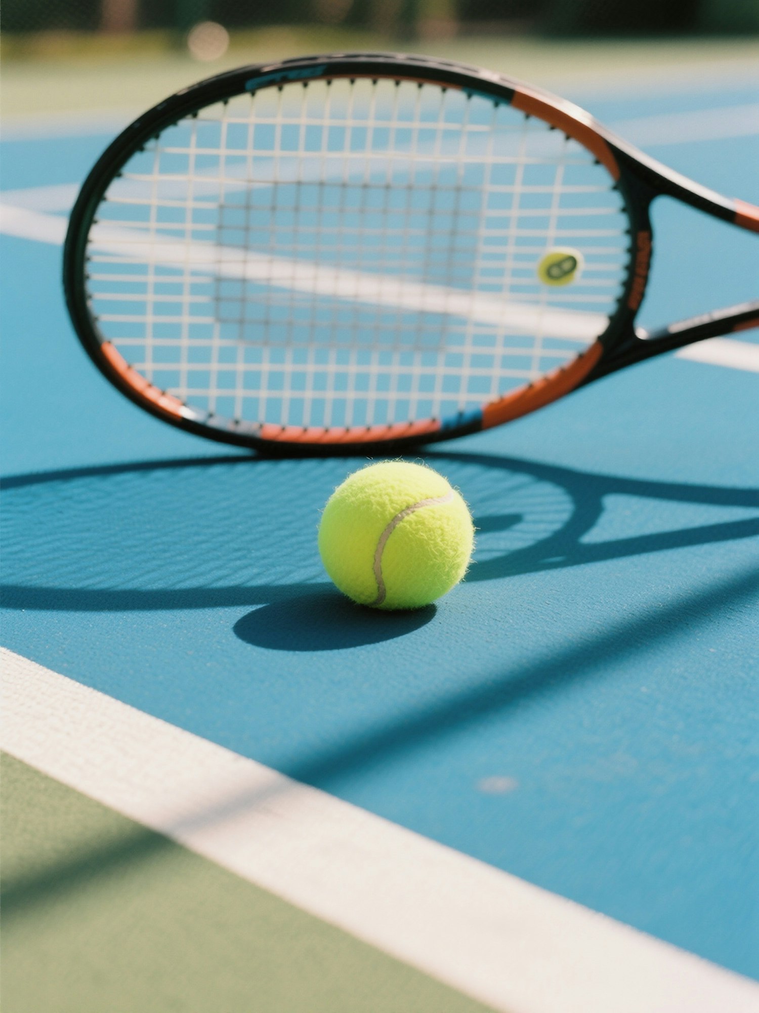 A tennis racket and ball on a blue court, with sunlight and shadows creating a dynamic and sporty atmosphere.
