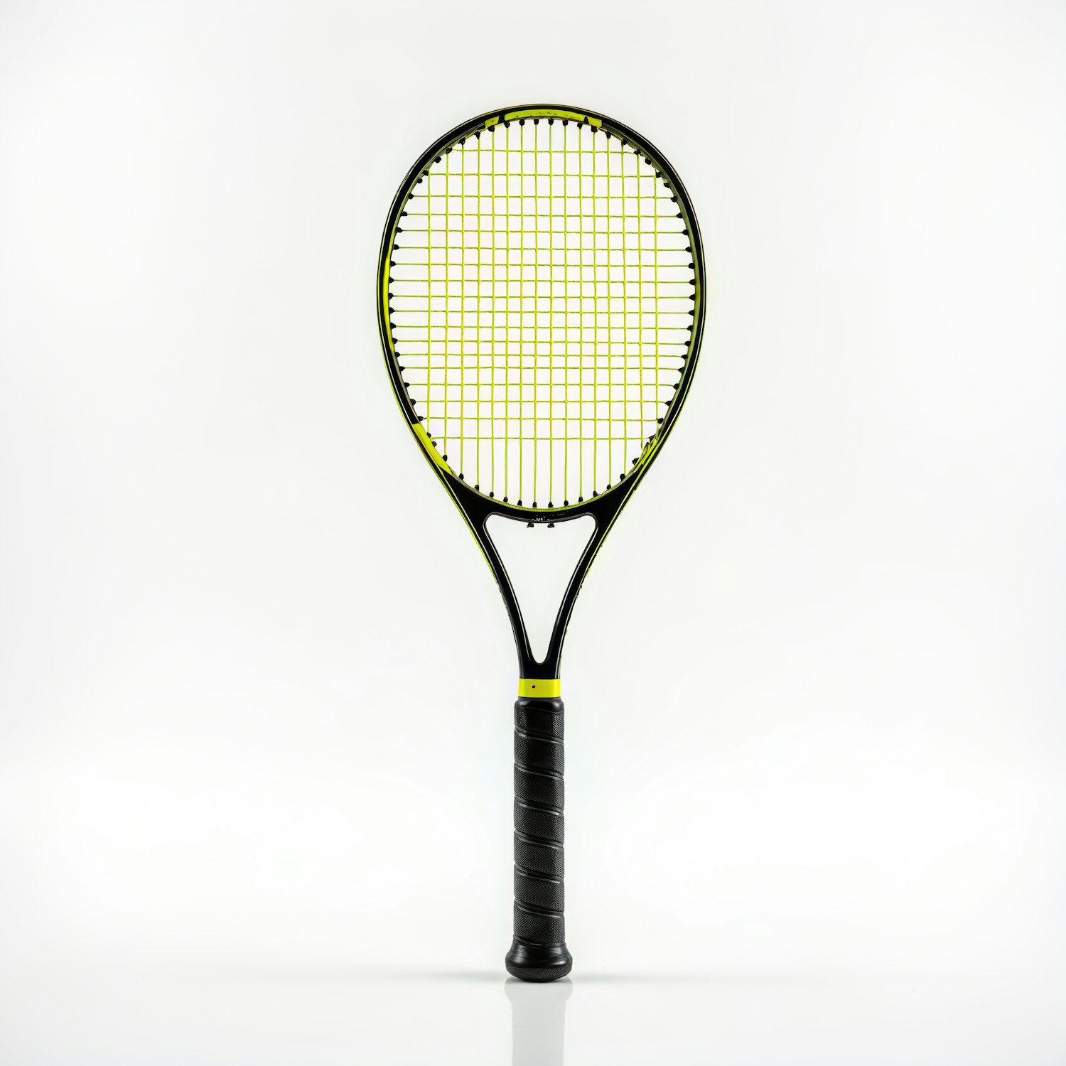 Sleek tennis racket with black frame and yellow strings on a white background, showcasing modern design and functionality.