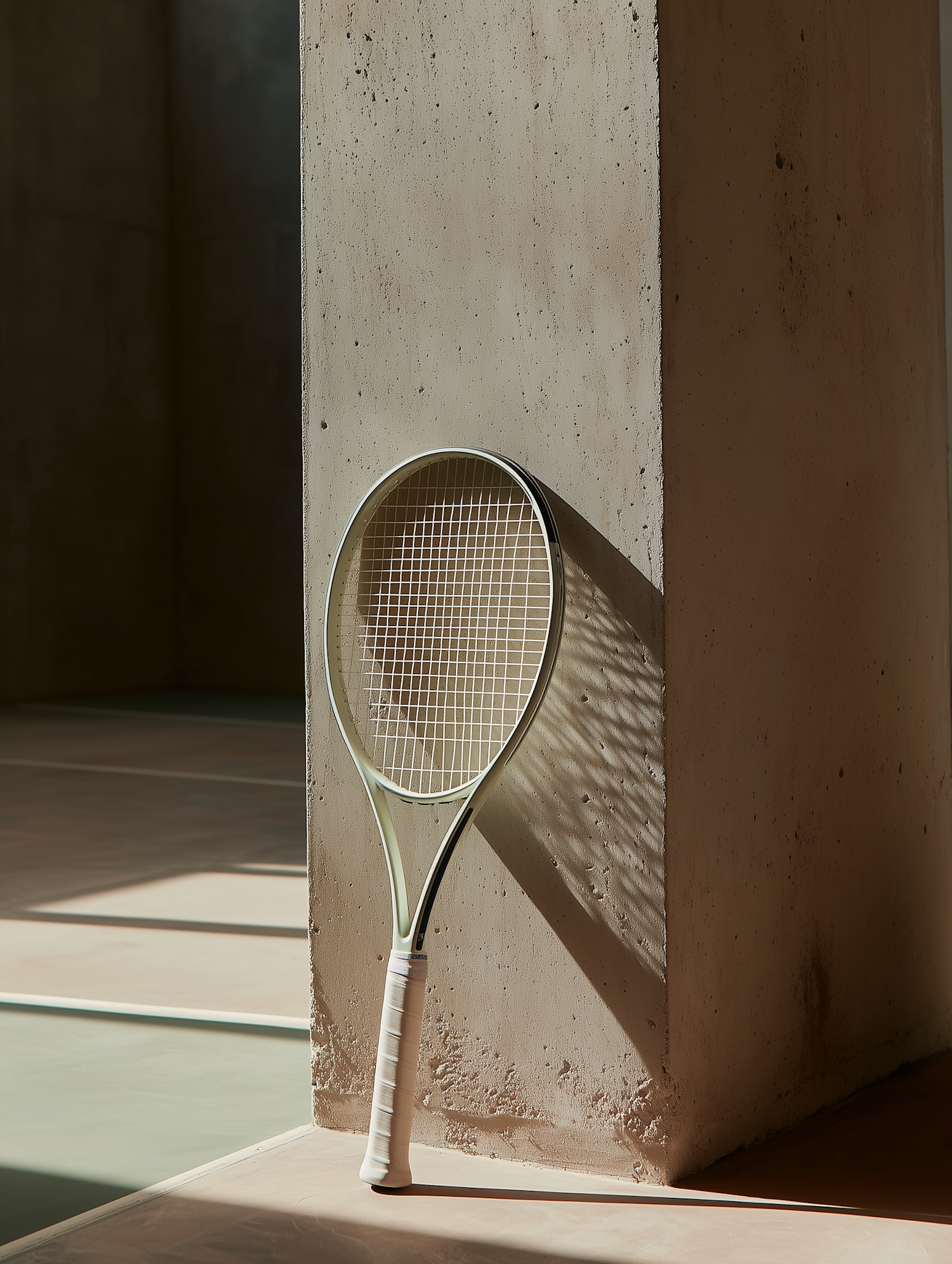 A tennis racket rests against a concrete wall, with soft light and shadows creating a minimalist and serene sports-themed composition.