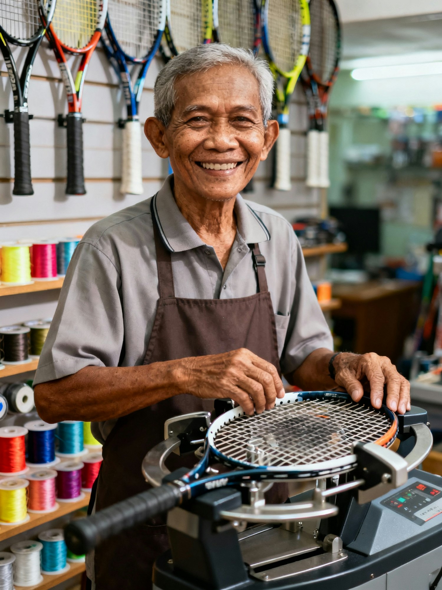 A smiling elderly man works on a tennis racket in a workshop, surrounded by colorful strings and rackets, showcasing his craftsmanship.