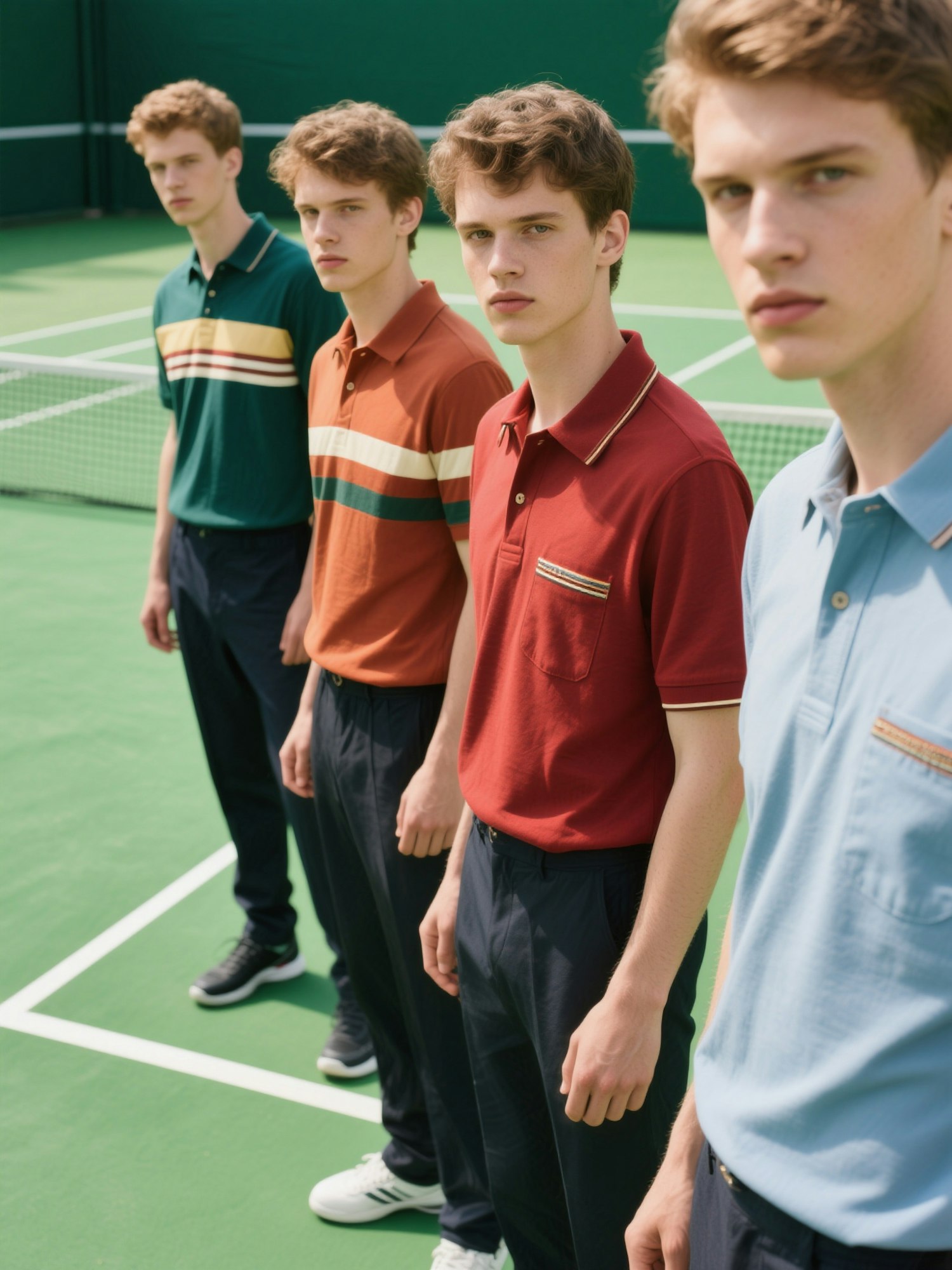 Four young male models in a retro-sporty shirts with high-end fashion editorial on a green court, focused expression, ,fashion photography, no racket, the mood is retro-sporty and clean --sref 3721090848 --sref 2560033873