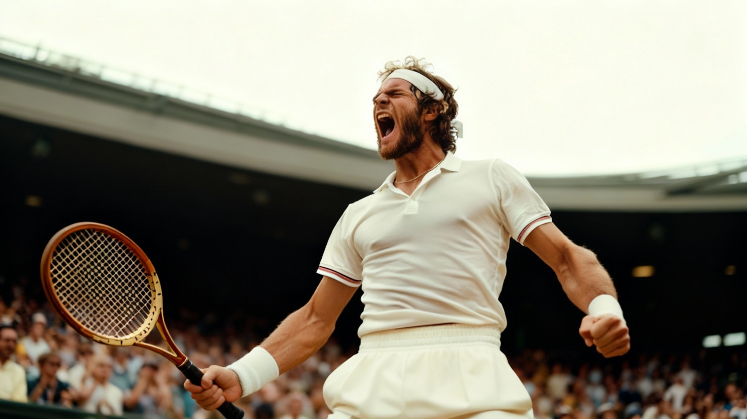 A tennis player celebrates passionately on the court, holding a wooden racket, with a cheering crowd in the background.