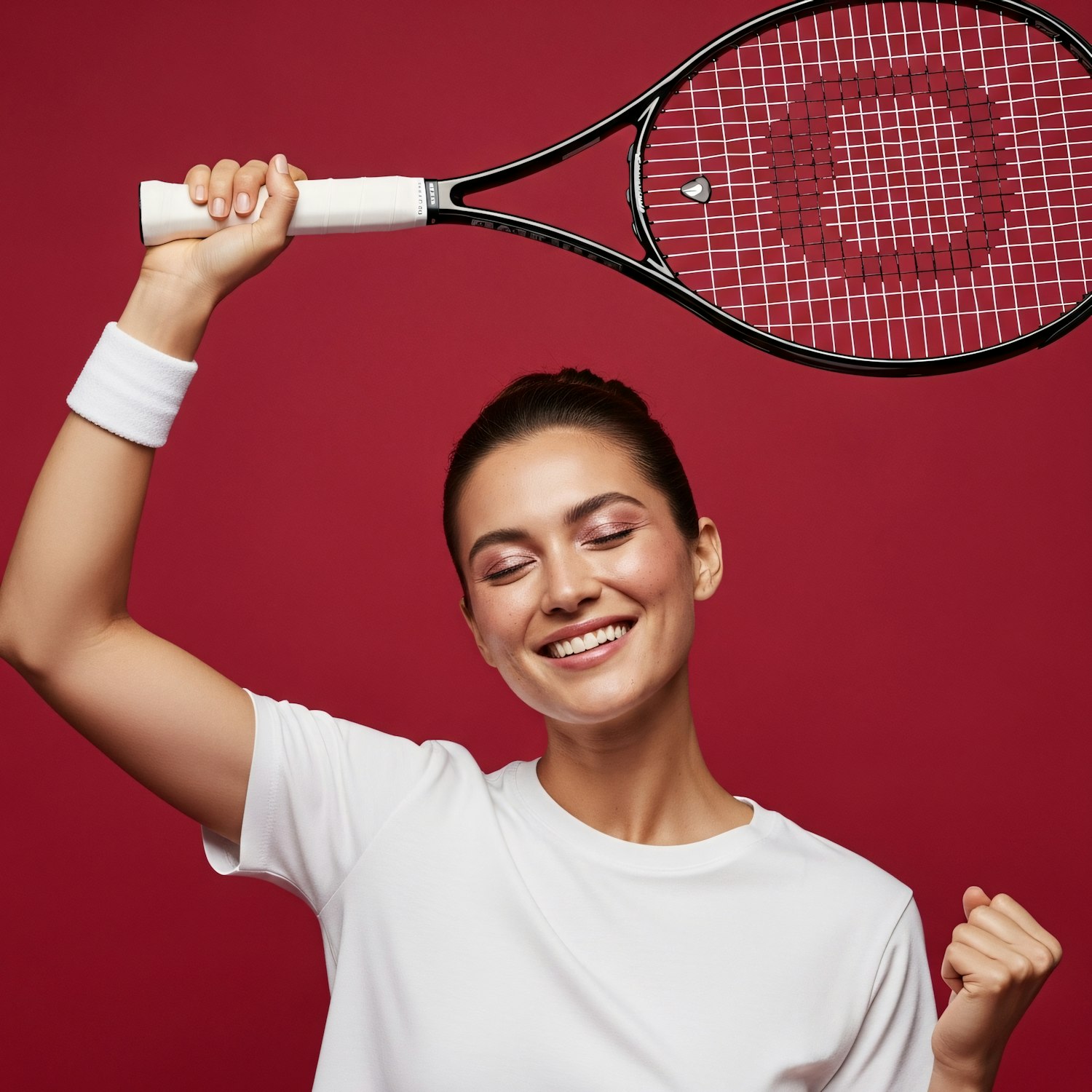 A smiling woman holding a tennis racket celebrates against a red background, wearing a white t-shirt and wristband.