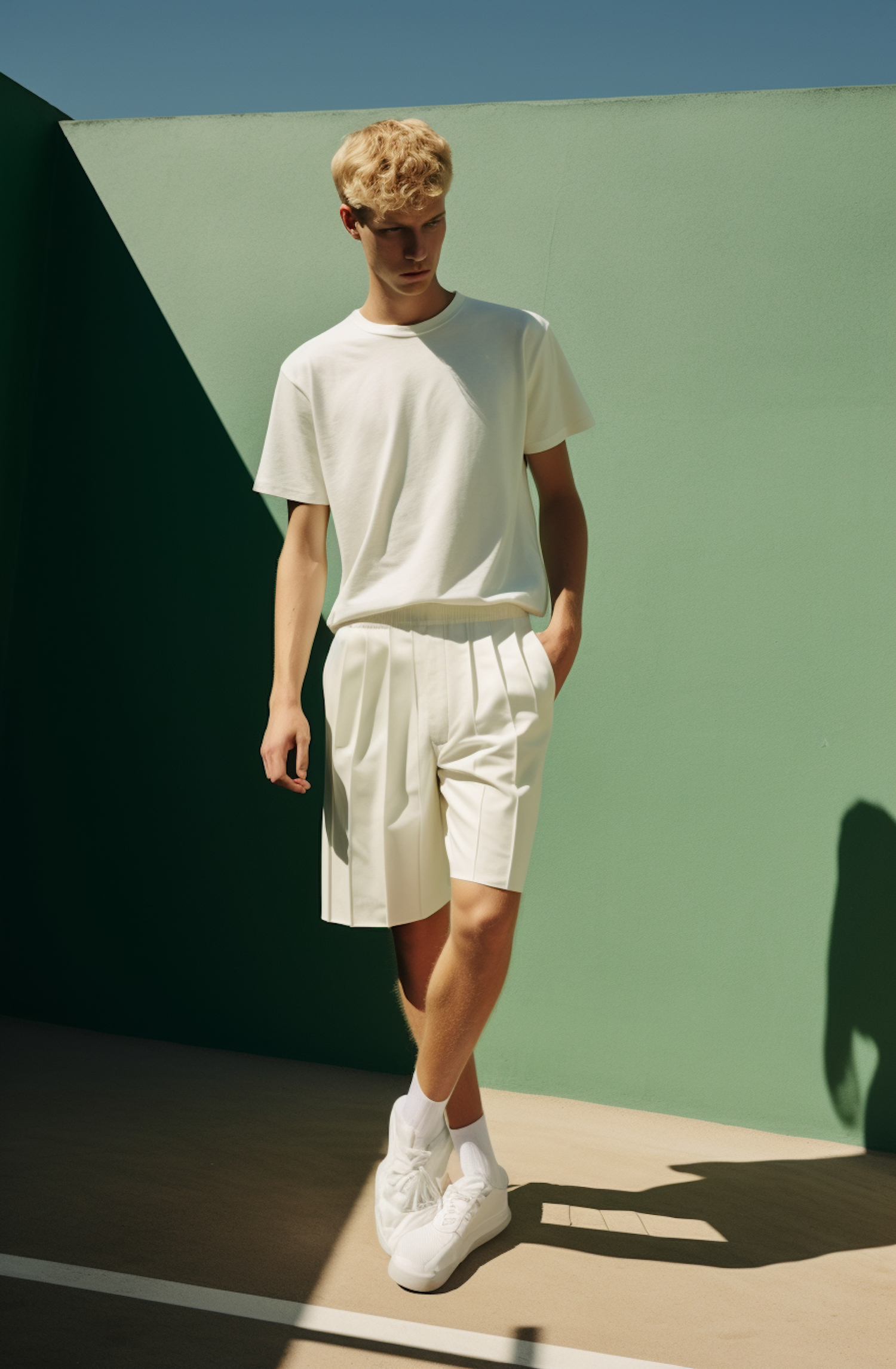 Young man in white outfit against a green wall, casting a shadow. Minimalist fashion with a modern, clean aesthetic.