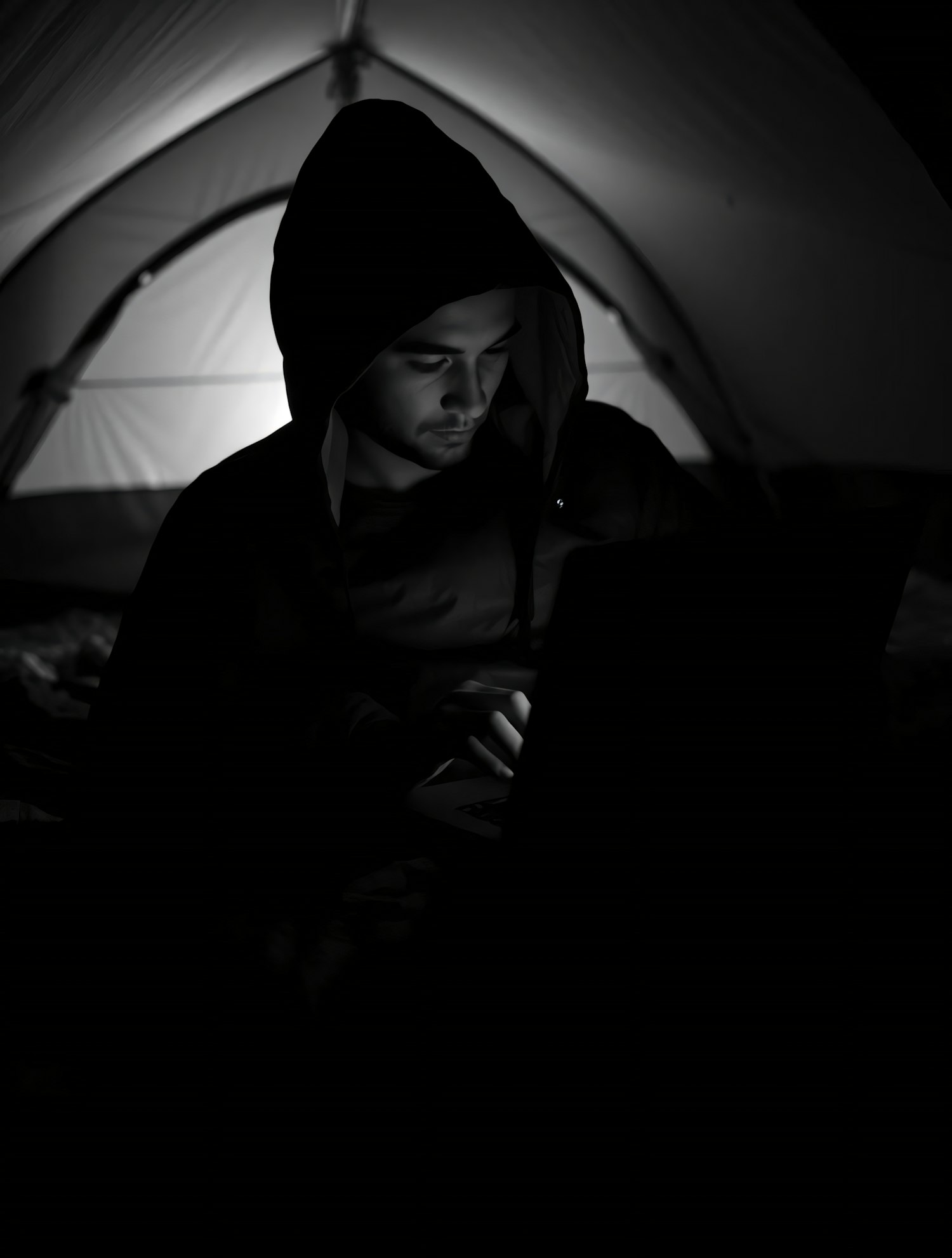 A person in a hooded jacket sits in a dimly lit tent, illuminated by a laptop screen, creating a focused and serene atmosphere.